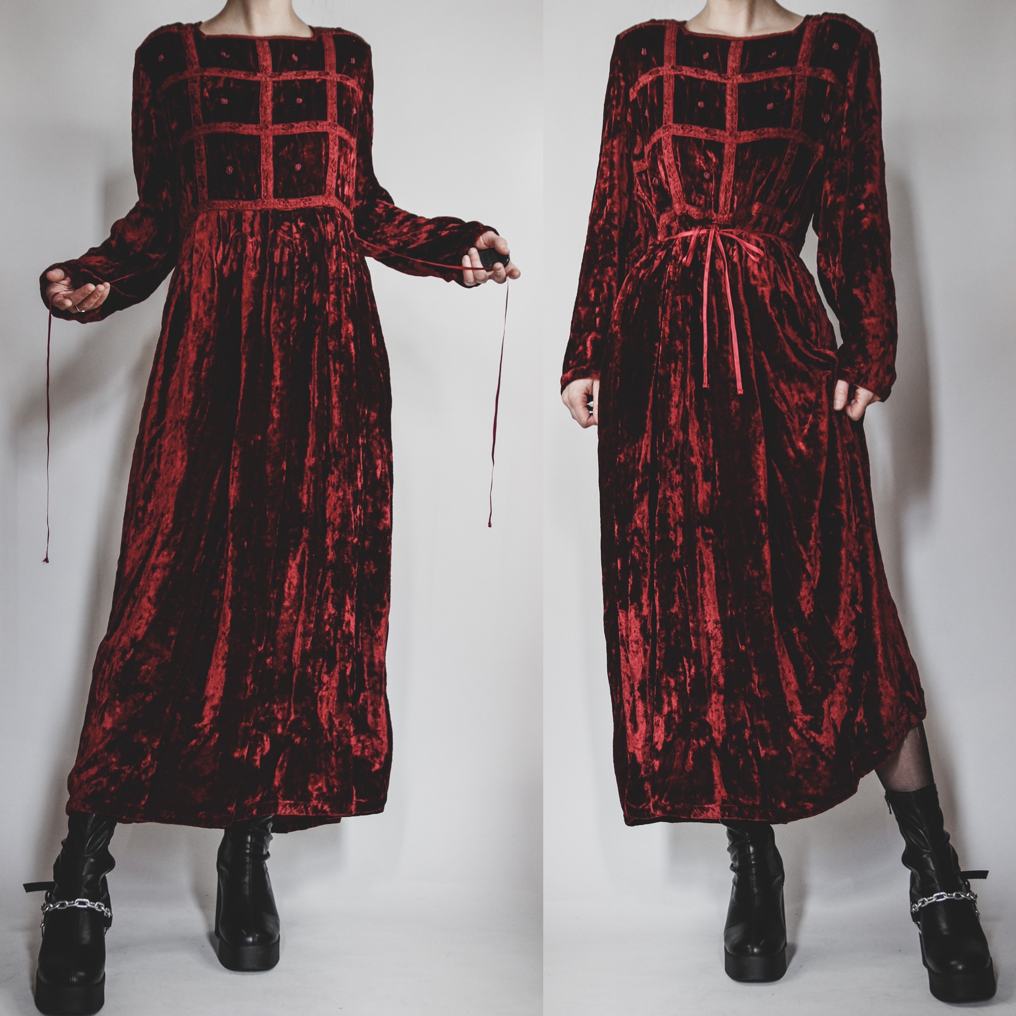 Vintage 90s wine-red velvet dress. Witchy whimsigoth holiday vibes, perfect for all your upcoming festive events! 100% rayon, no stretch other than the back thanks to the ruching. Gorgeous crochet embroidery detailing in front. Fitted waist and A-line skirt. Back zip, unlined. Very soft with no itch factor unless you're sensitive to velvet or synthetic fabrics. Ribbon ties at the waist so you can cinch it in front or back. Original shoulder pads intact but can be easily removed if they're not your thing!