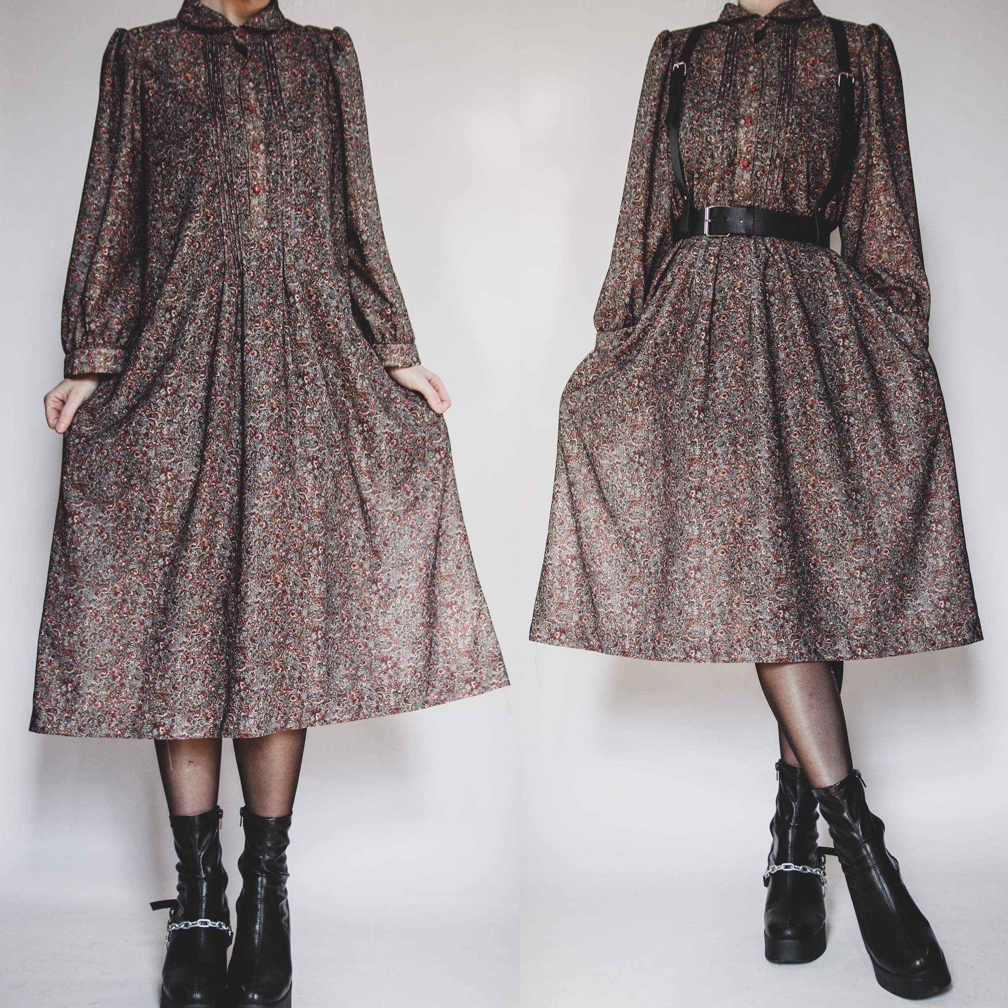 Vintage early 90s floral midi dress. This one looks simple on the hanger, but SO cute on! Lightweight semi-sheer floral print fabric. 100% polyester, may have some itch if you're sensitive to synthetics. Puffed shoulders, super roomy 3/4 balloon sleeves with fitted buttoned cuffs. Dainty collar, buttons down the front, and tuxedo detailing at the bust. Boxy, loose cut from the bust down, but looks amazing belted! Harness is not included. Unlined, no stretch. Buttons are functional but otherwise pull-on style.