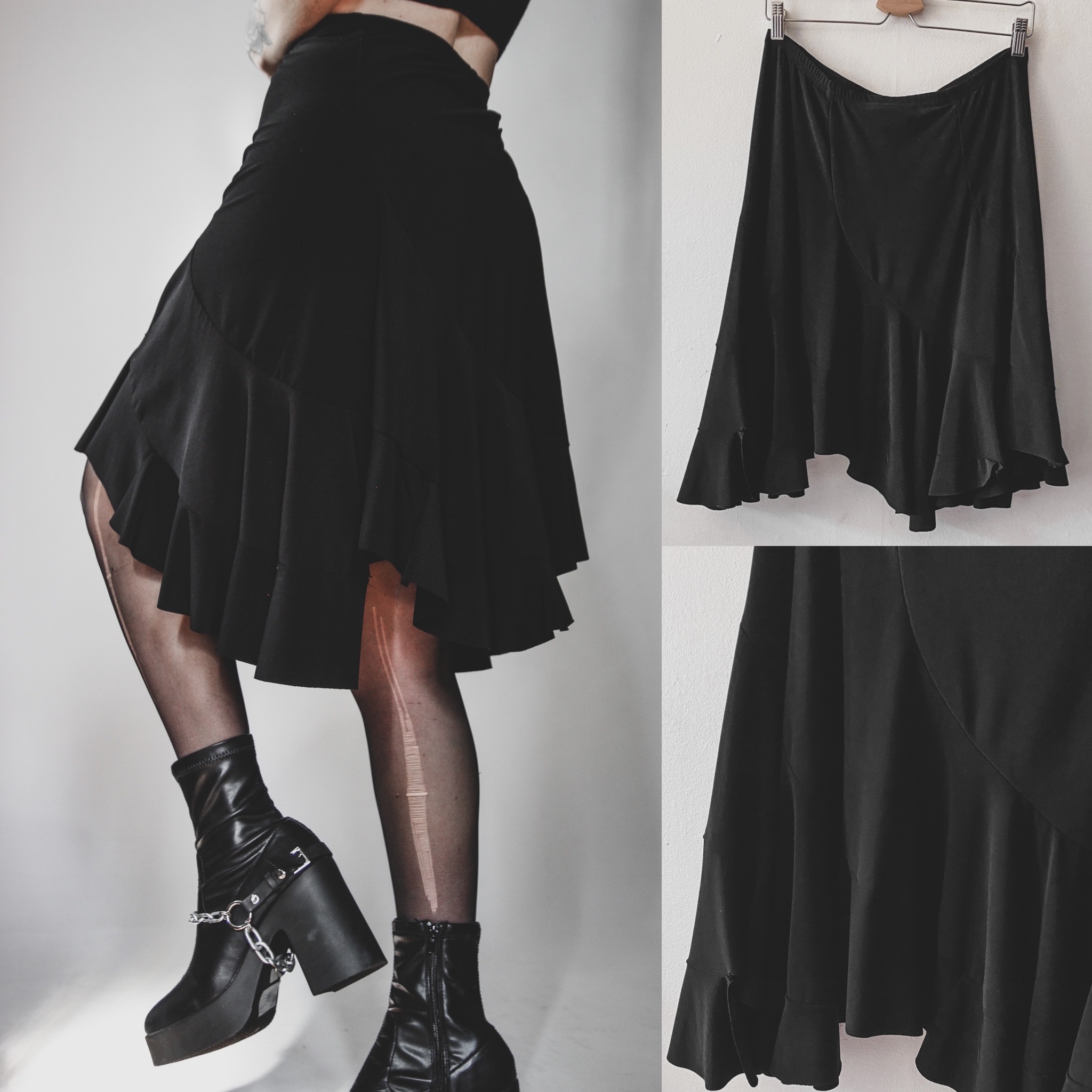 Vintage 90s Jus d'Orange asymmetrical skirt. Flared A-line cut with lots of movement around the hem. Fabric is a lightweight, slinky 92-8 poly-spandex blend. Pull-on style, meant to be worn high or mid waisted. Elastic waist. Unlined and stretchy all over.