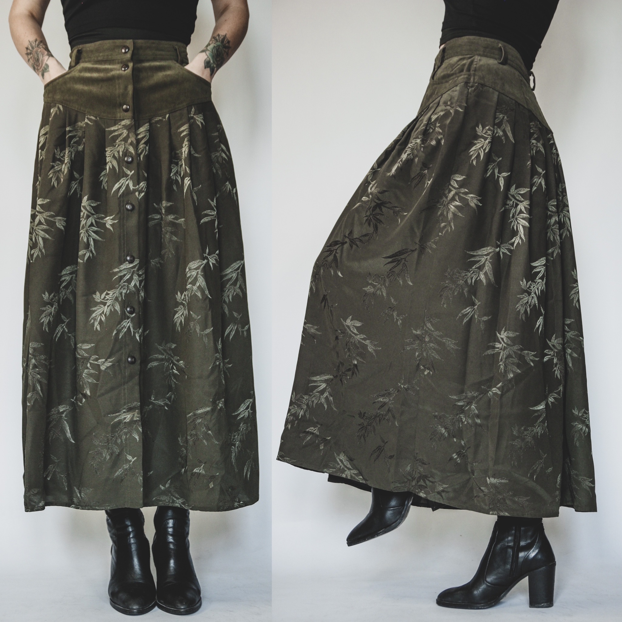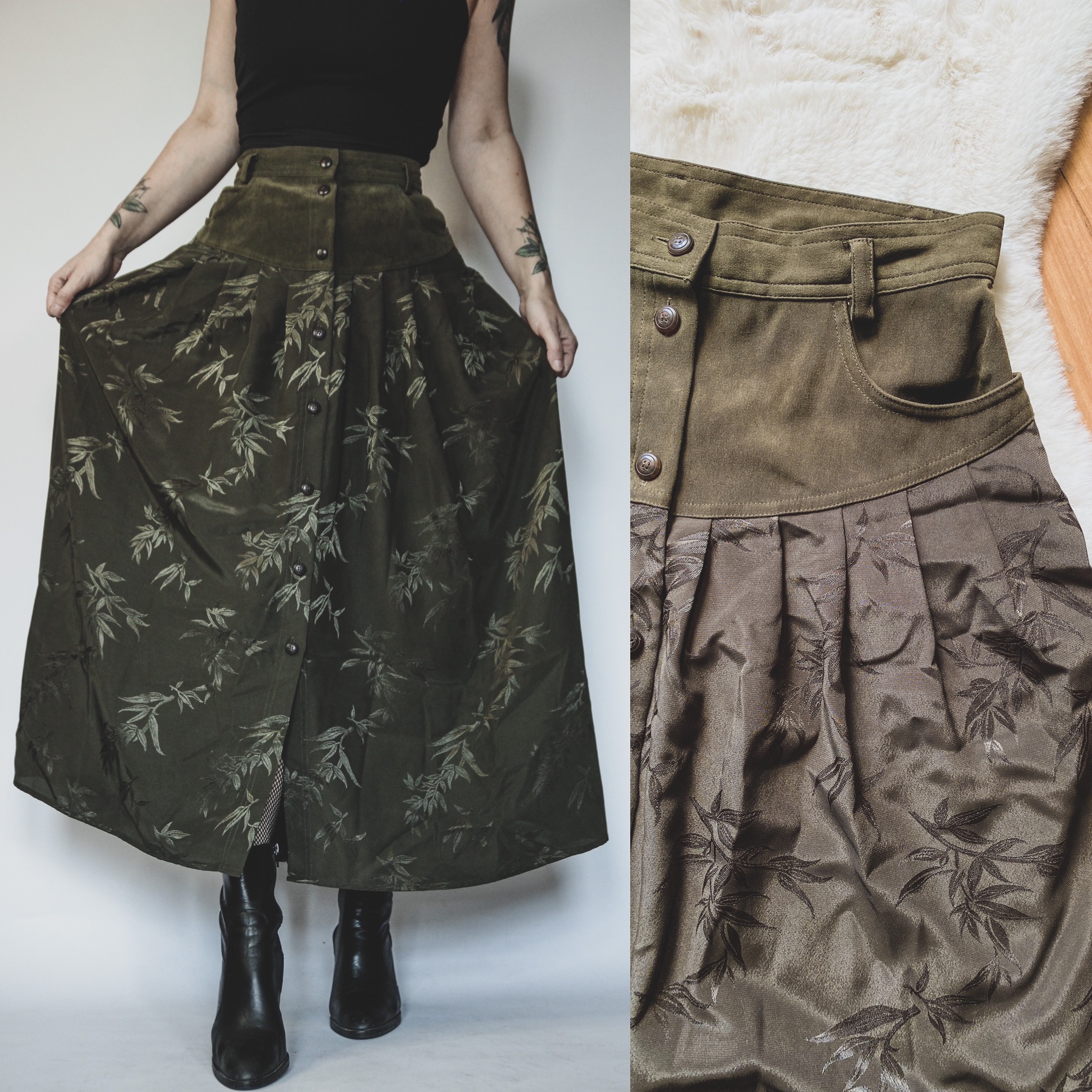 Vintage 90s Together olive green skirt. So many fun details on this one! Western-inspired faux suede yoke at the top, functional buttons down the front with a hidden snap button to keep it from gaping. 3 pockets and belt loops. Bottom half is A-line cut, faux silk with an embossed botanical design and soft pleats. 100% polyester, no stretch, unlined.