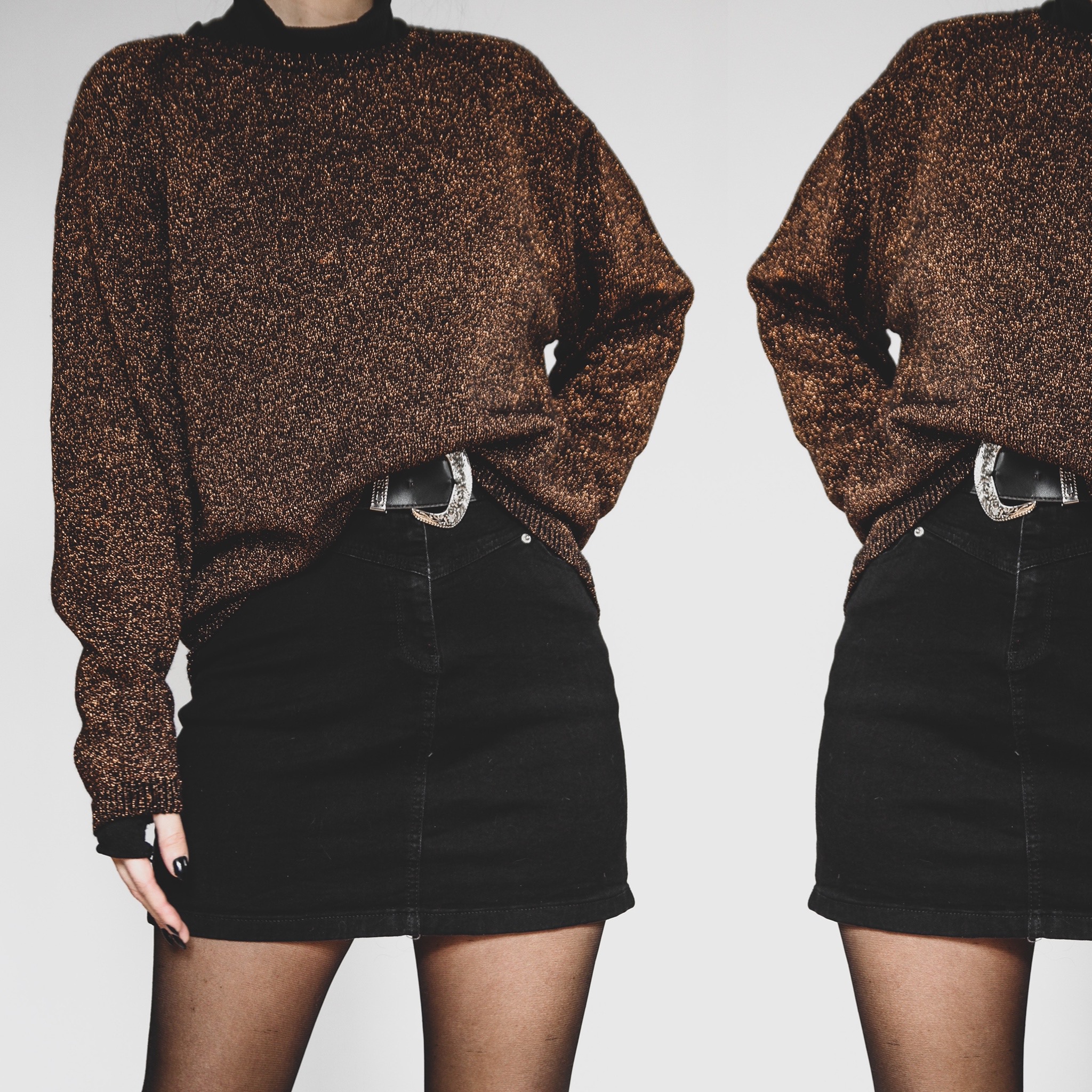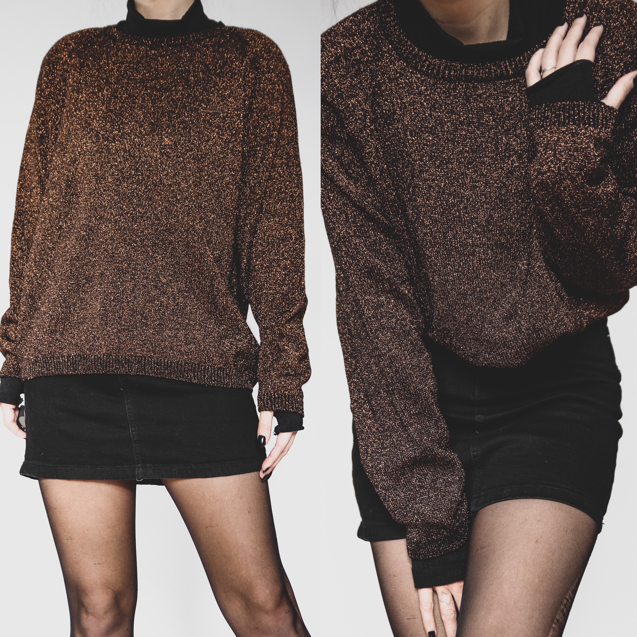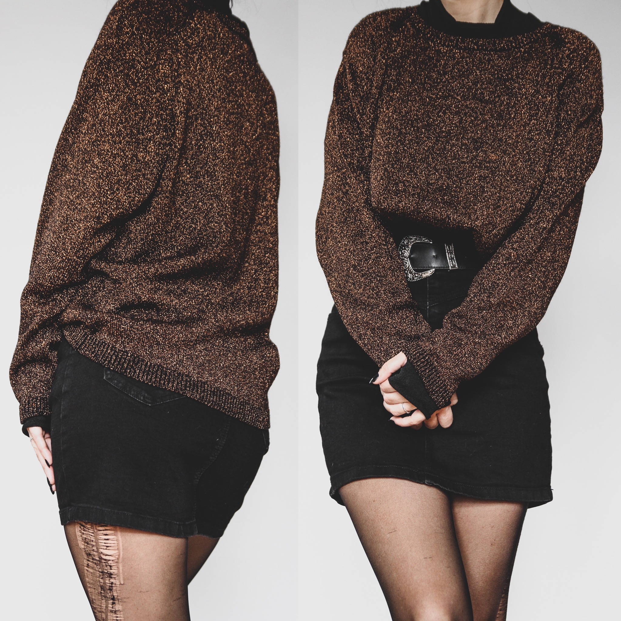 Vintage 90s Bay Club Petites signature sweater. All Last Rites sweaters are one-of-a-kind unisex finds, straight out of the 70s, 80s and 90s! This one is a classic pumpkin orange and black glitter. 60% acrylic, 40% metallic. May have a bit of itch factor if you're very sensitive to knits, but layer up with a turtleneck or thermal underneath and you'll be fine! Original shoulder pads intact, but they can be easily removed if they're not your thing. Perfectly broken in, slouchy and cozy. Balloon sleeves and boxy cut with a slightly fitted hem for that perfect bubble shape, and easy to tuck in!