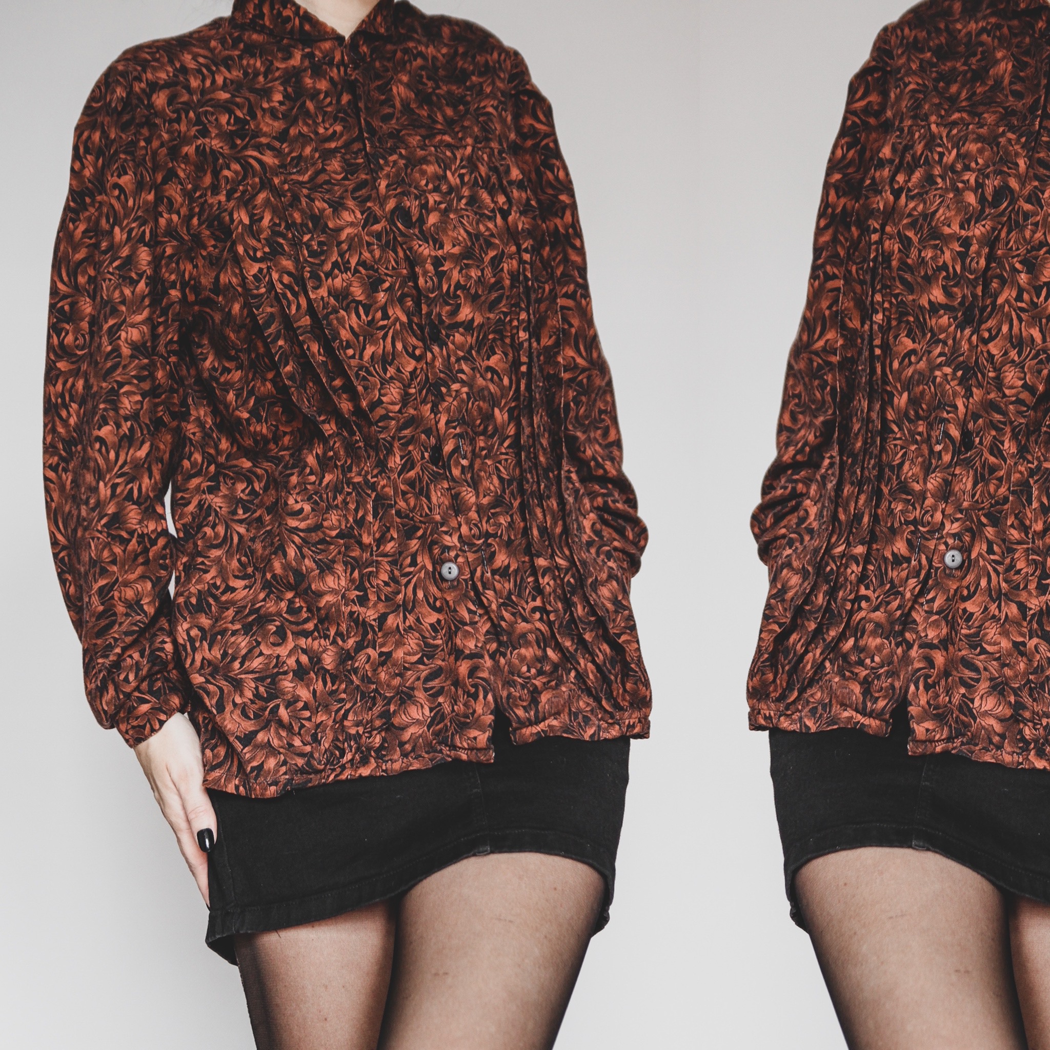 Vintage 90s Relance Made in Canada blouse. Ultra soft, perfectly broken in with a faded black and orange floral print. Fabric tag is completely faded but feels like rayon or a poly-rayon blend. Front pleats, slighly puffed shoulders, balloon sleeves with fitted cuffs, mini rounded collar and functional buttons. Easy to dress up or down!