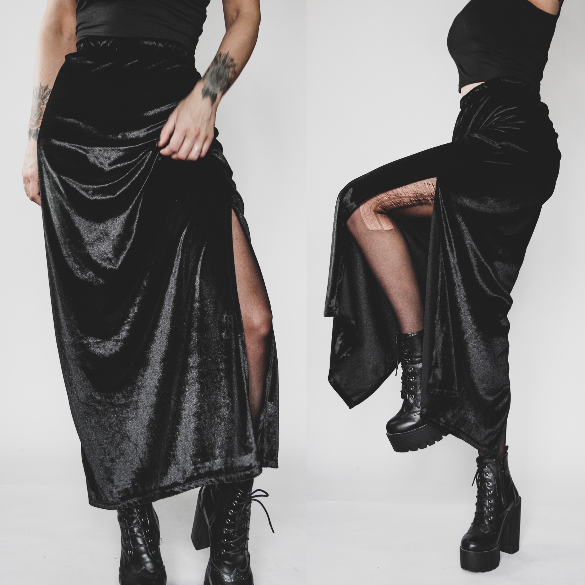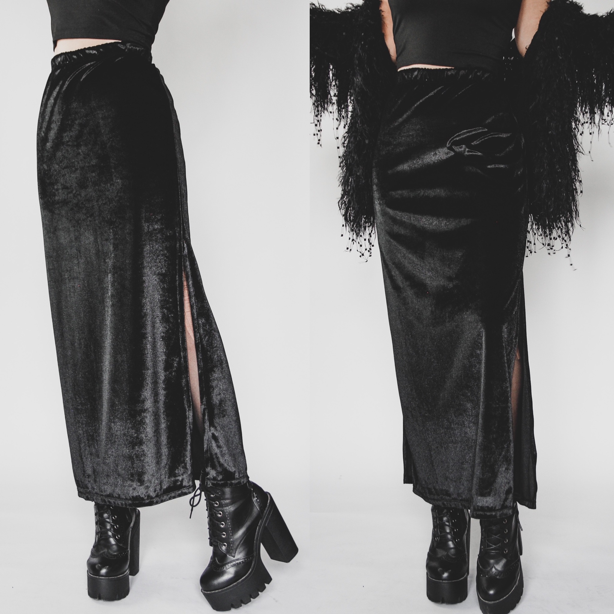 Vintage 90s black velour velvet maxi skirt. This one is a cold weather staple! High side slit for some extra drama. Pull-on style with a ruched elastic waist. Meant to be worn high waisted. Unlined, no stretch but fabric does have a bit of "give". 100% poly. Lightweight and soft.