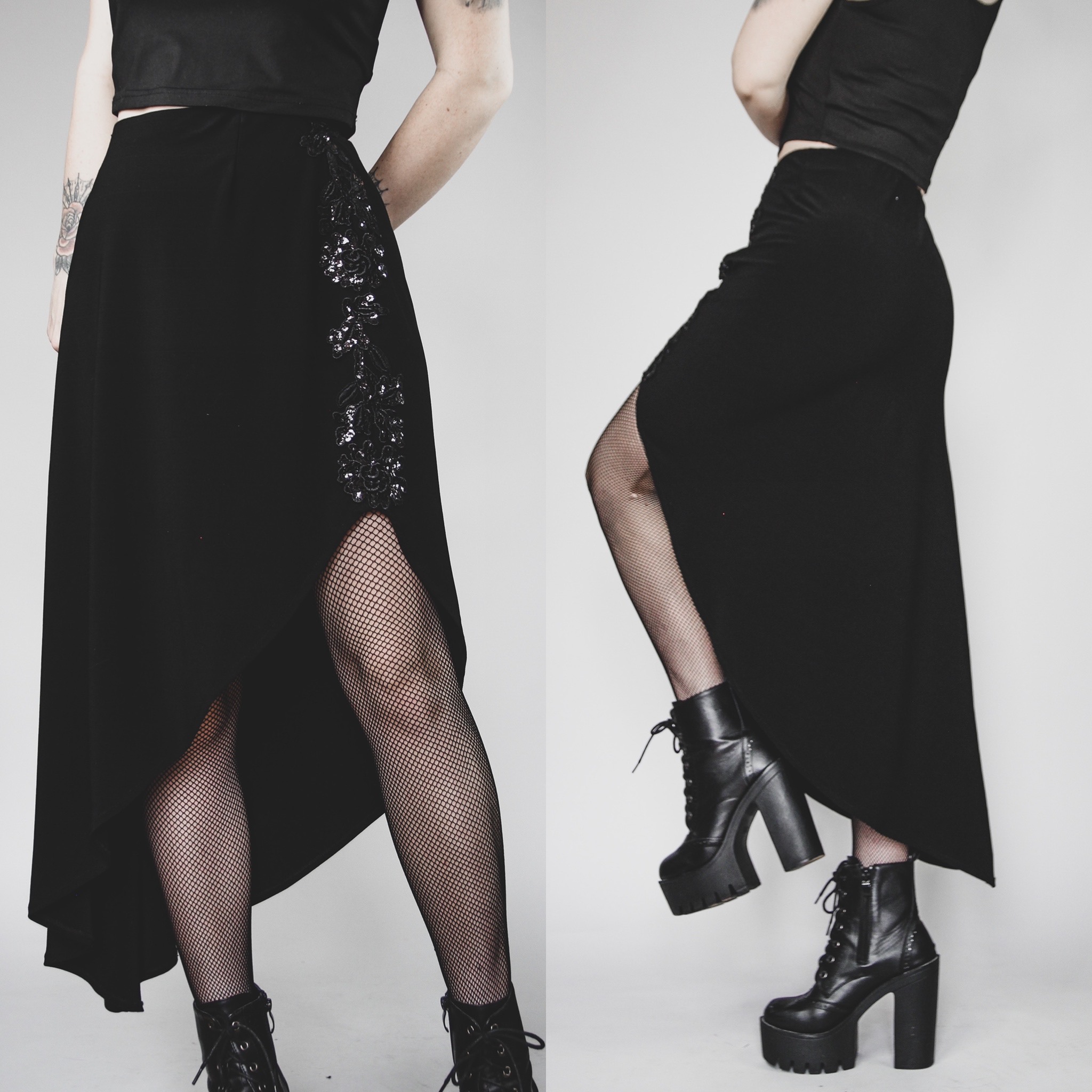 Vintage 90s Sagaie Paris midi skirt. Matte black poly spandex in a draped asymmetrical cut, with a sequin floral applique detail. Hidden elastic waistband. Meant to be worn high waisted. Unlined, pull-on style, stretchy all over. So perfect for witchy holiday glam!