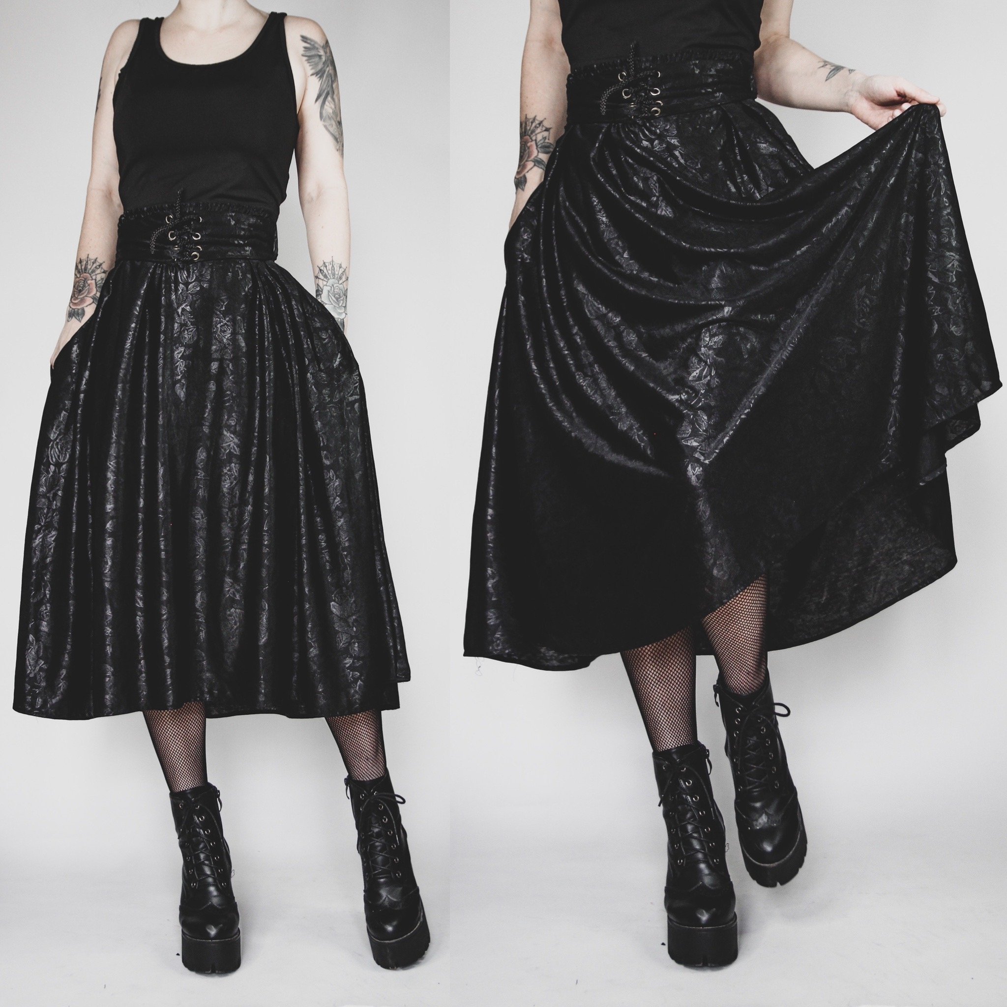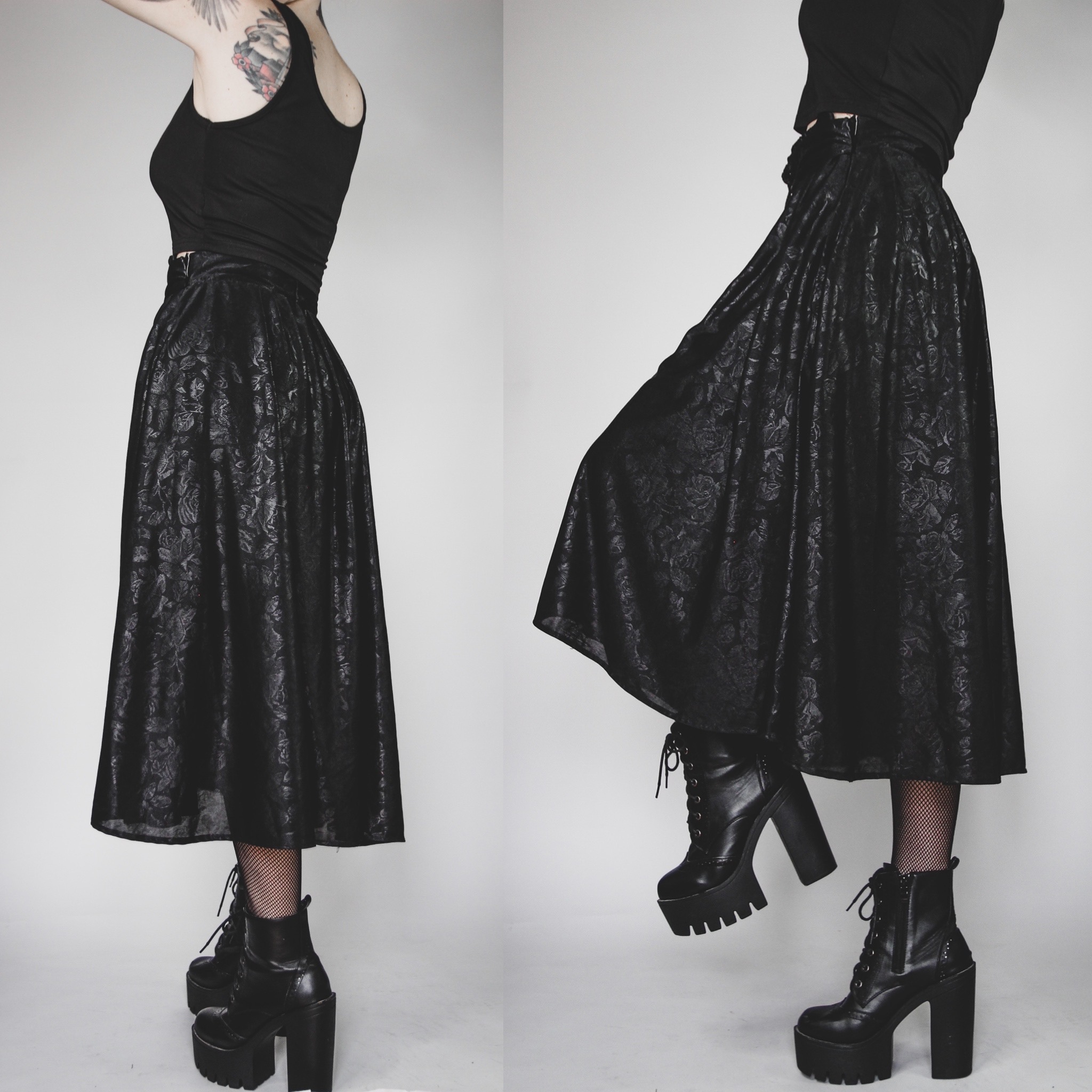 Vintage handmade floral satin circle skirt. This is truly a one-of-a-kind find! First off, SHE HAS POCKETS! Soft, lightweight poly satin with a shiny floral pattern. Wide ruched elastic waistband. Lace-up belt is a separate panel, attached on either side of the waist but not attached in the front. The cord is adjustable but rather short in length. Full A-line cut with lots of movement. Lined in a separate shorter layer of black poly satin. No stretch other than the waist. Meant to be worn high waisted. Pull-on style.