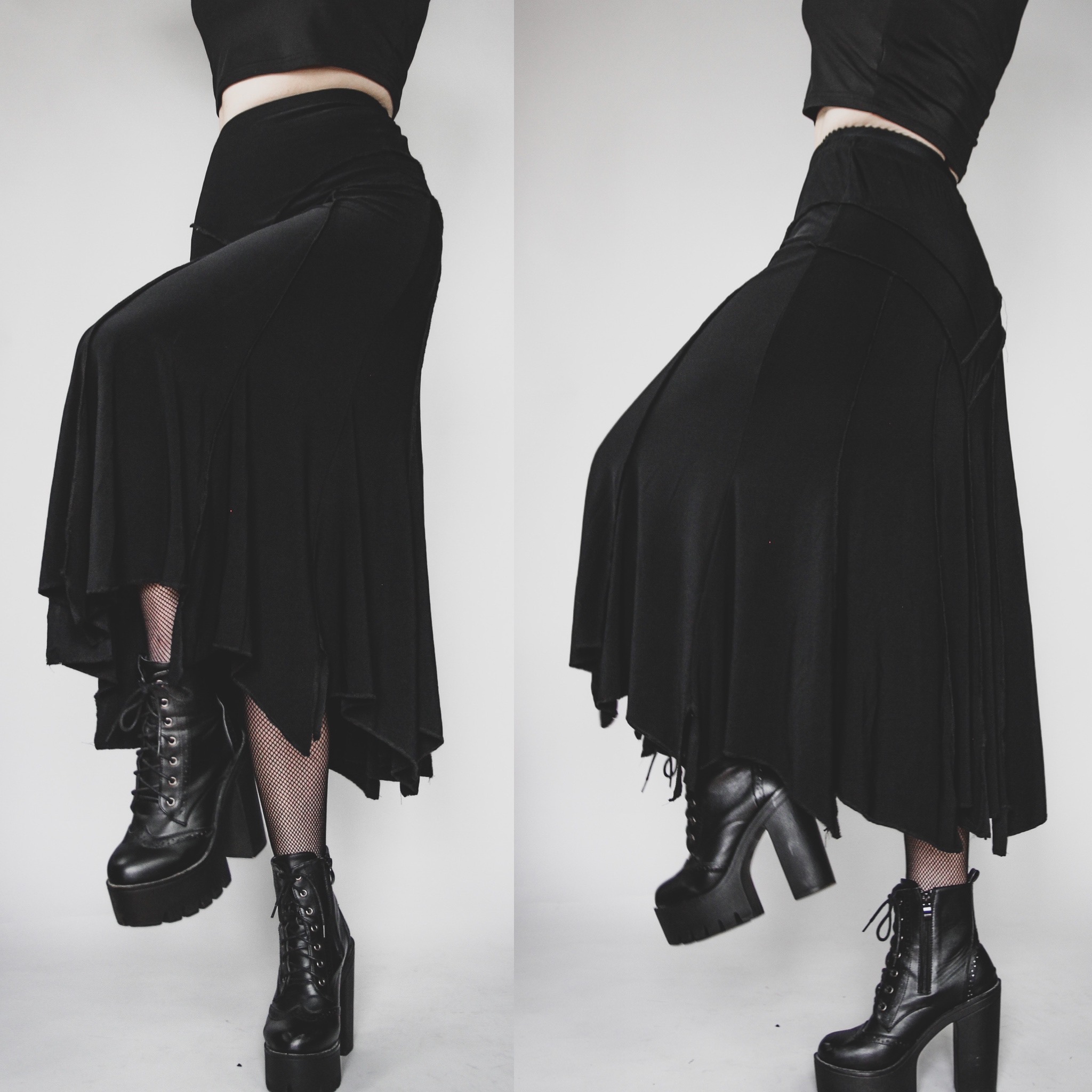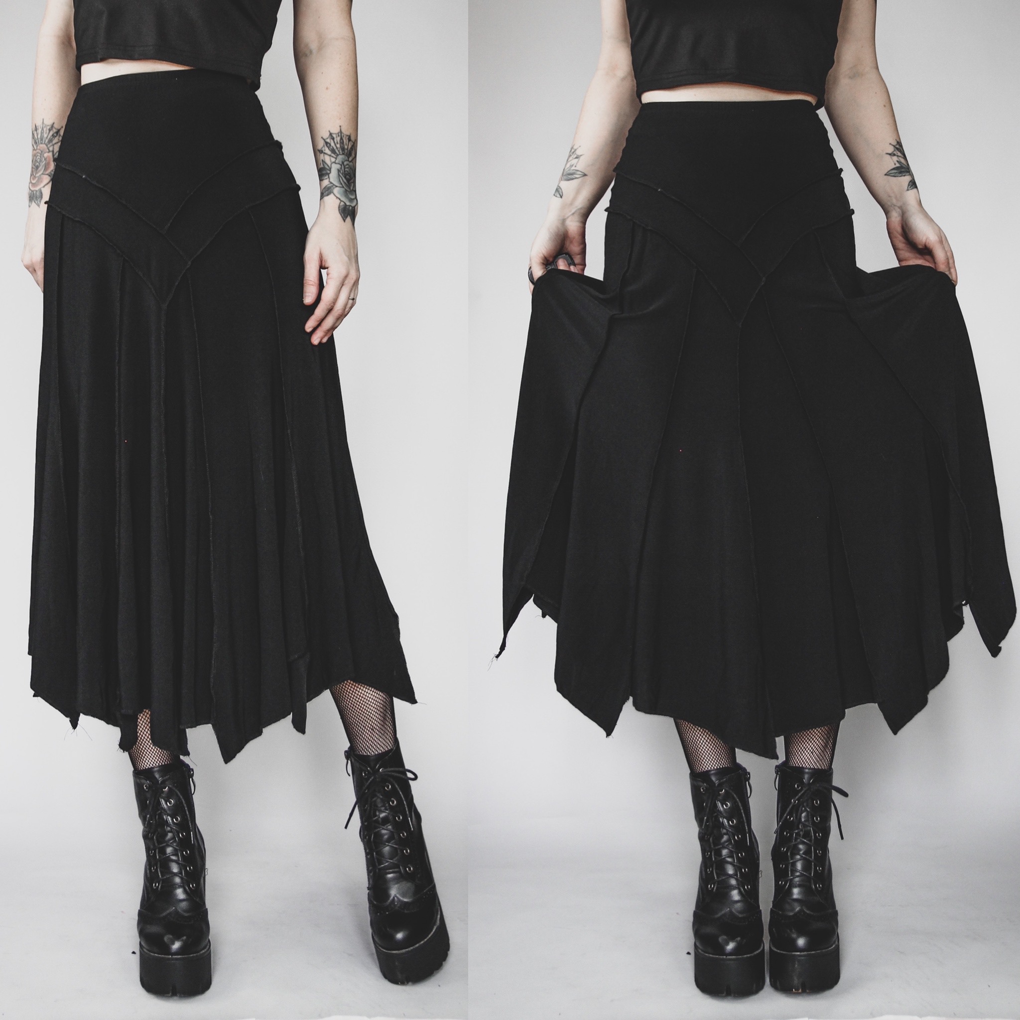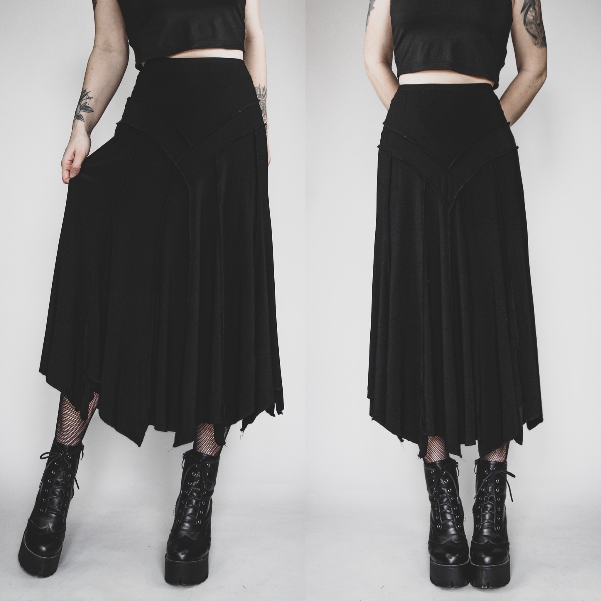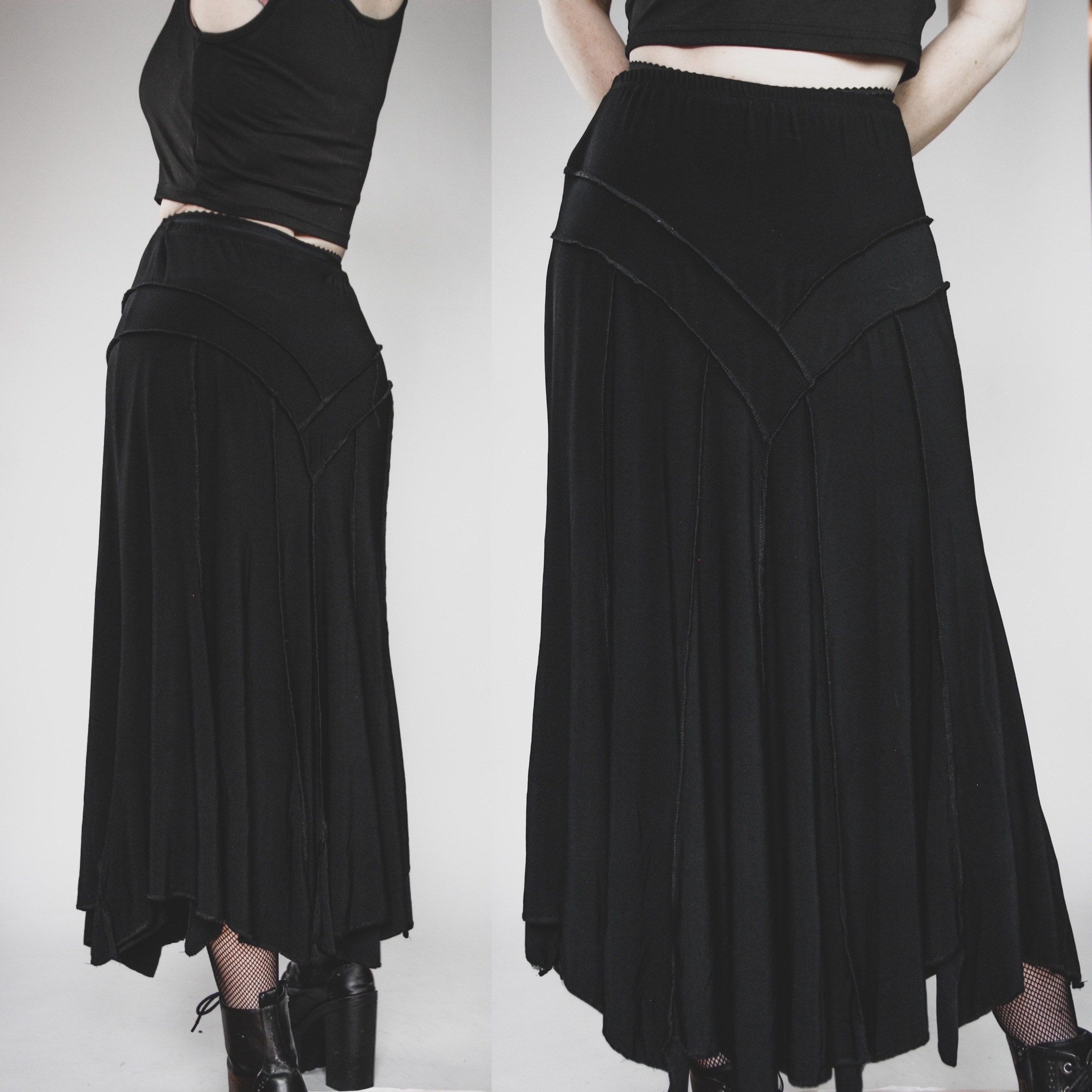 Vintage 90s Elegant Wear handkerchief-hem skirt. 92-8 poly-spandex fabric, matte black with plenty of stretch all over. Exposed seam detailing and tons of gorgeous slinky, flowy movement! Meant to be worn high waisted. Unlined, pull on style with an elastic waistband.