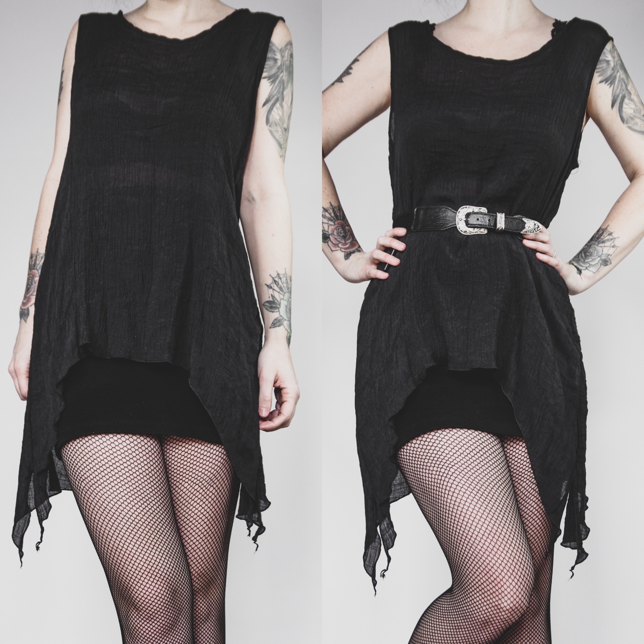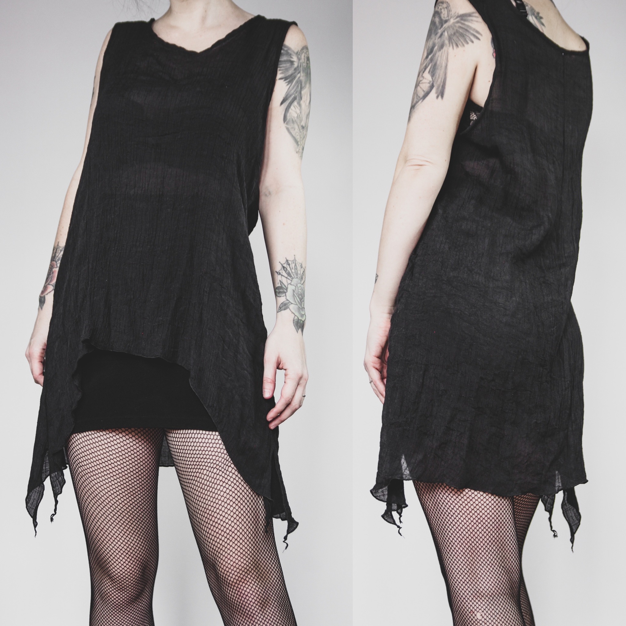 Vintage 90s asymmetrical tank top. A witchy staple piece! Semi-sheer crinkle-textured off-black poly fabric. Classic longline tank cut with flowy bat hem, longer on the sides. No stretch, unlined.