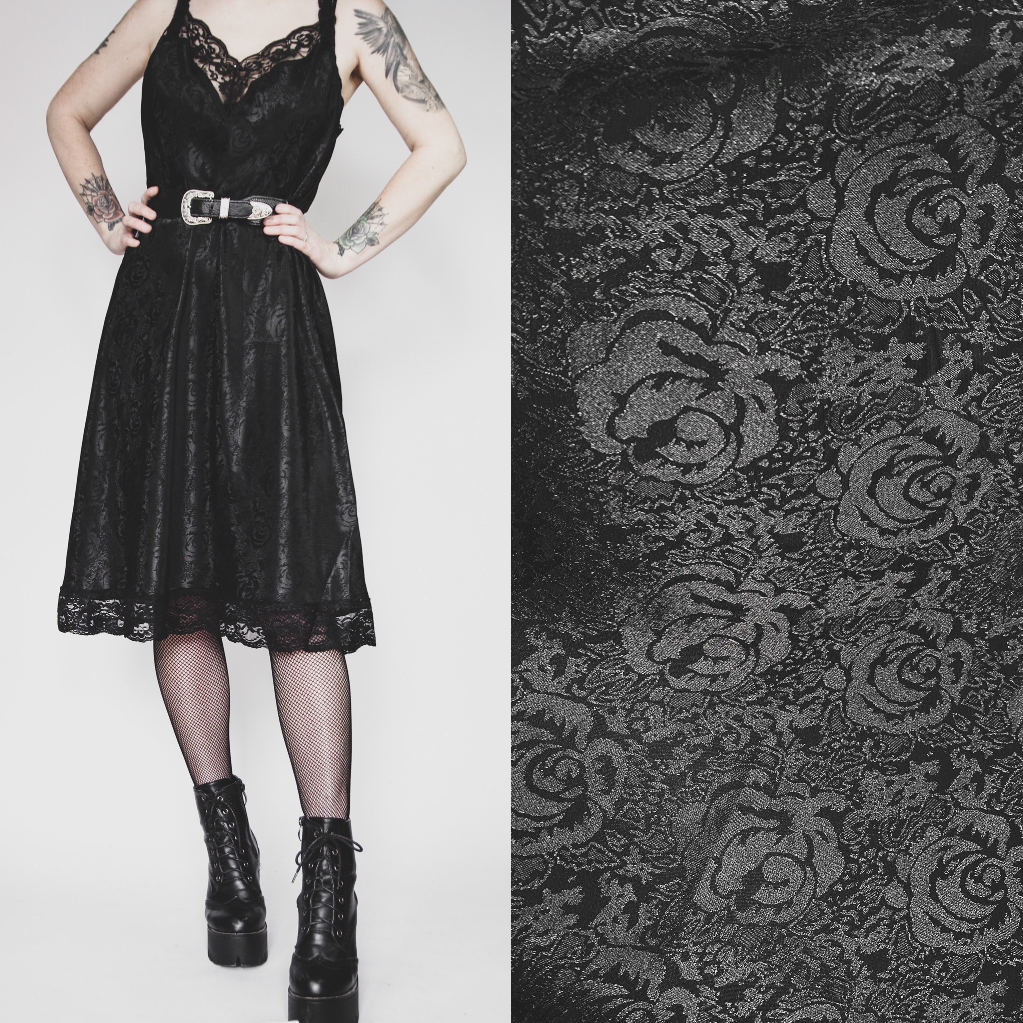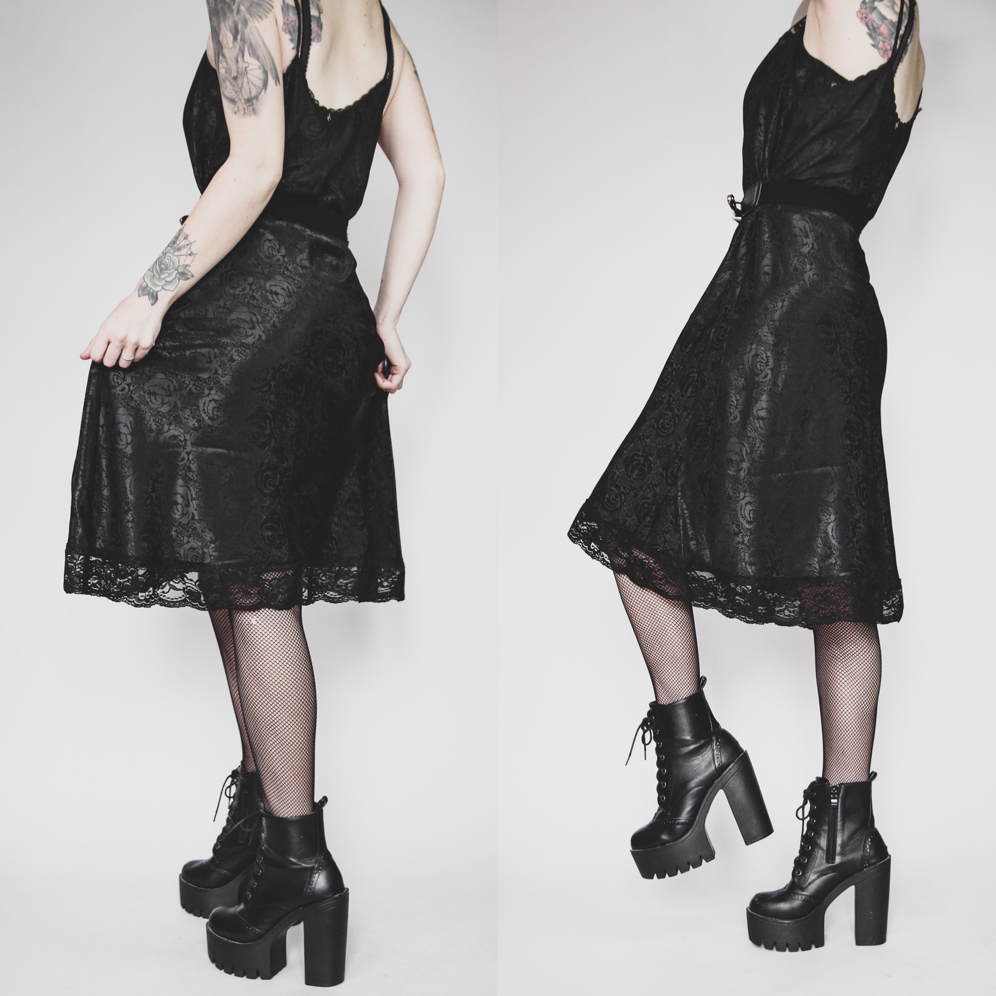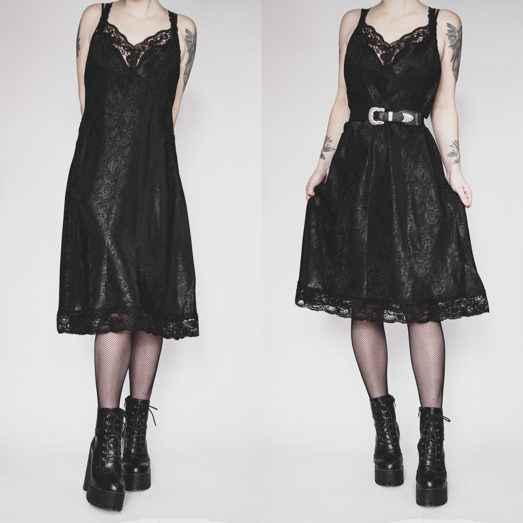 Vintage 80s floral satin nightie. Black poly satin with a shiny embossed floral pattern all over. Lace trim and front bow detail. V-neck, boxy straight cut. Straps are non adjustable. No stretch. Unlined, fully opaque (super rare for vintage nighties!) so it can be worn as loungewear/sleepwear or styled up for daytime or a night out. Belt is not included.