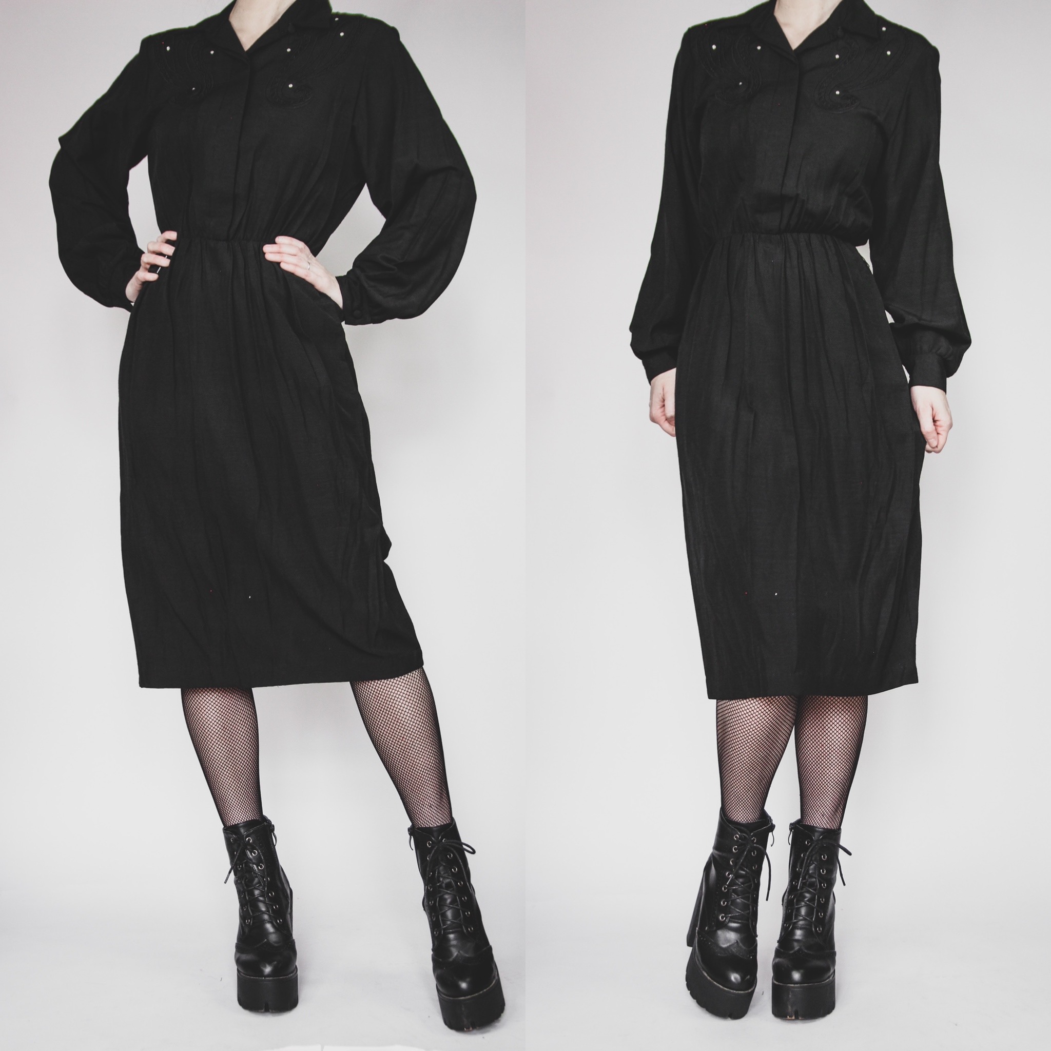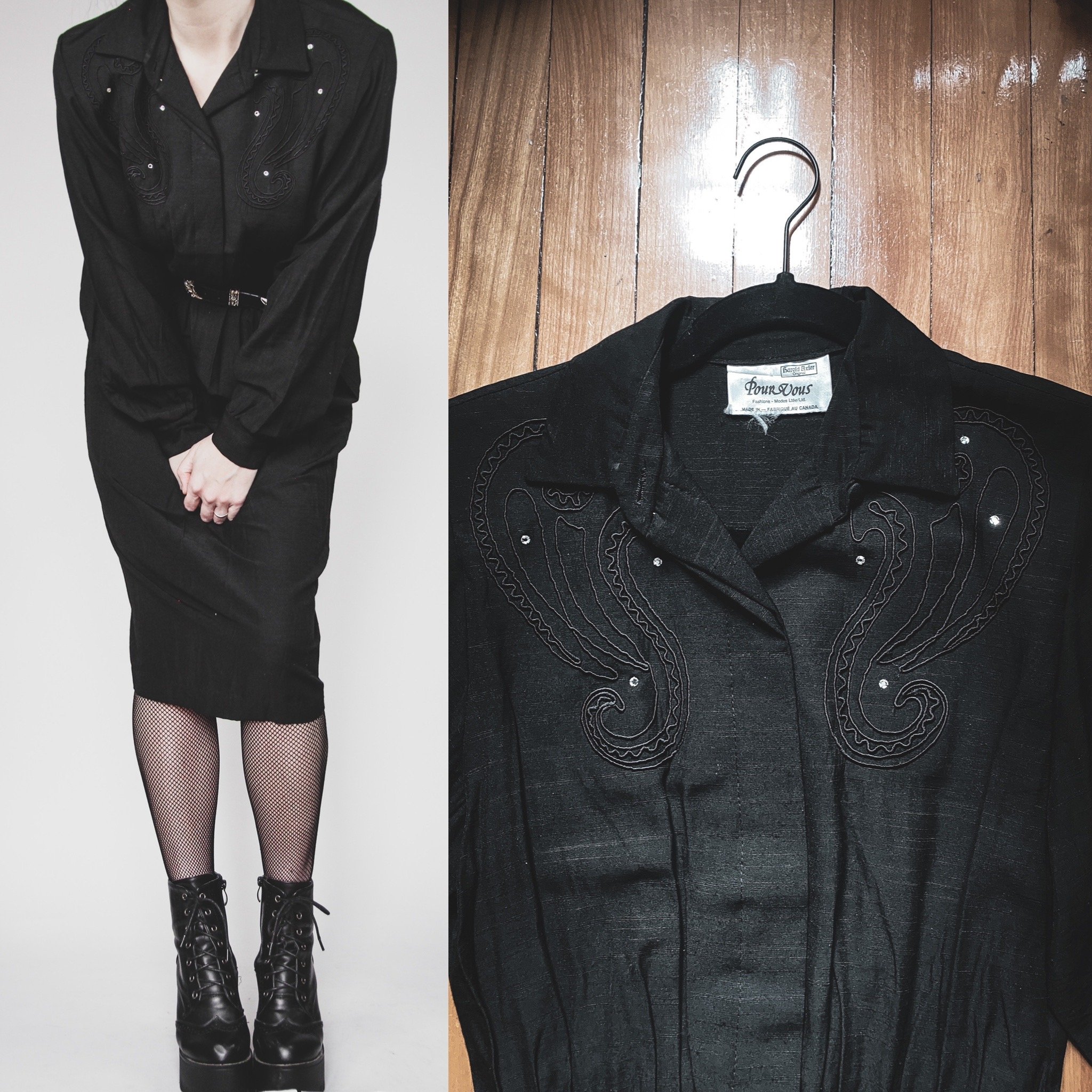 Vintage 80s Harold Baxter Pour Vous western-inspired dress. This one is such a statement piece! Embroidered oversize paisley details on the front with rhinestone accents. Hidden front buttons up the bodice. Waist is cinched elastic with thread belt loops on either side. Loose pencil cut midi skirt and roomy sleeves with fitted buttoned cuffs. Roomy in the bust. Fabric tag is gone but feels like a cotton-rayon knit blend - like a super lightweight denim. Unlined with no stretch. Belt is not included.