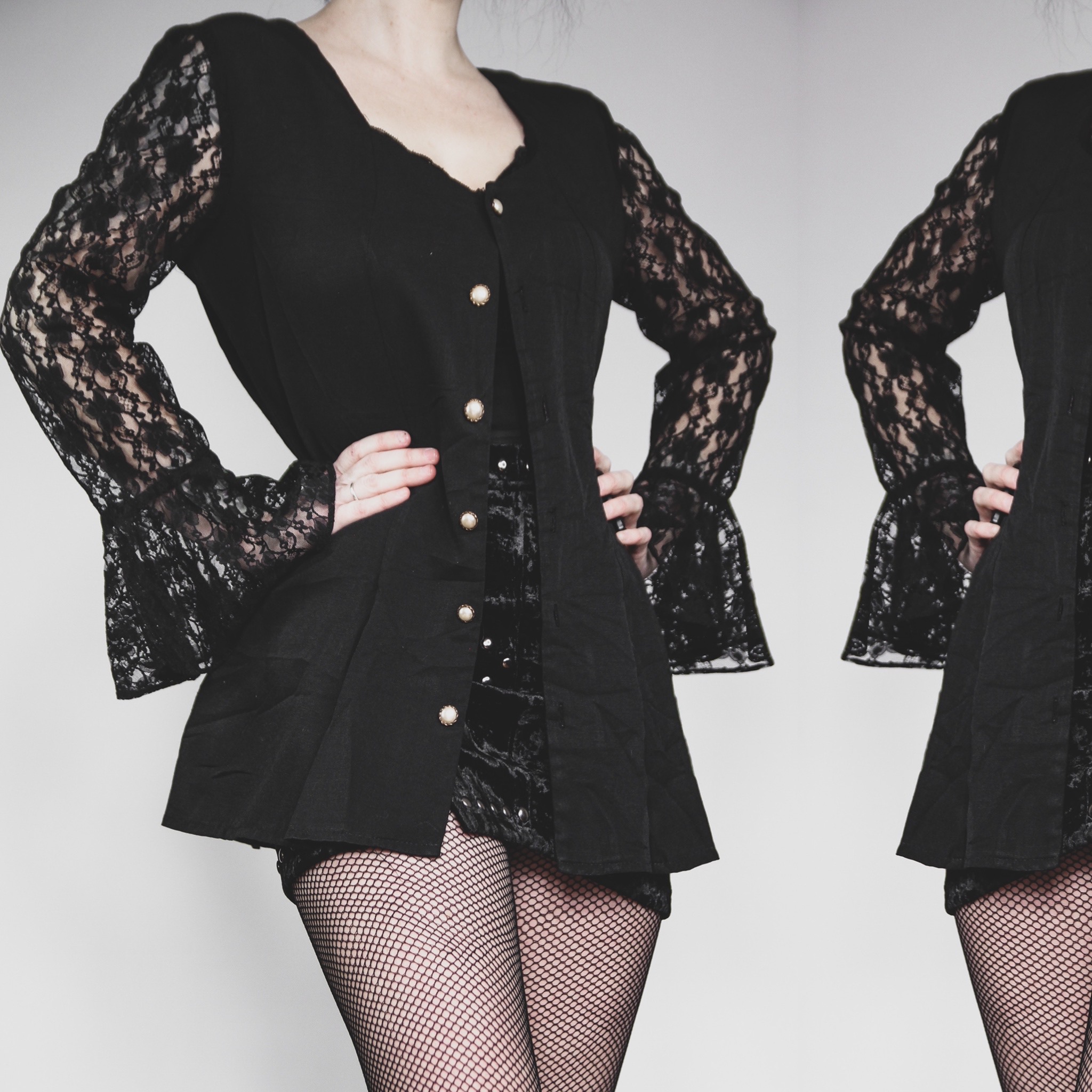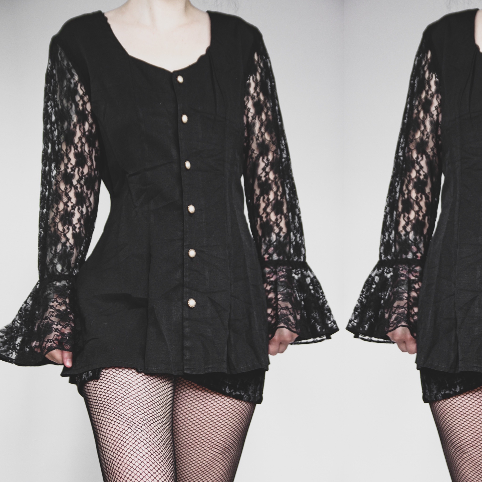 Vintage 80s blouse. The ultimate witchy statement piece! Sheer lace bell sleeves. Gorgeous functional gold and pearl oversize buttons down the front. Super flattering peplum cut is fitted at the waist with a slight flare. Adjustable lace ties in the back so you can cinch the waist to your liking. Original shoulder pads intact, but they can be easily removed if they're not your thing. Slight longline cut. Unlined, no stretch whatsoever. 65-35 poly-viscose blend, may have some itch if you're sensitive to lace or synthetics.