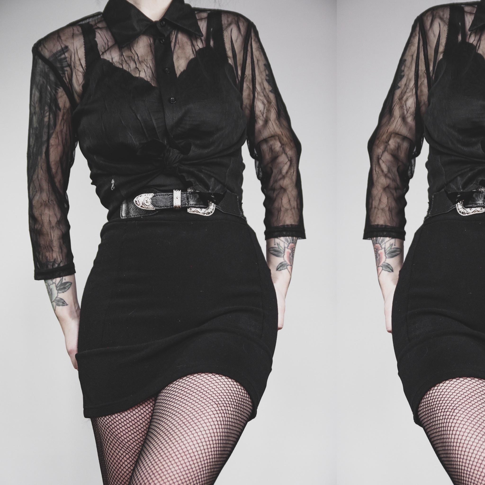 Vintage 90s sheer blouse. Lightweight crinkle-texture sheer poly mesh. Button down with fitted 3/4 sleeves. Boxy, slightly cropped cut. Looks super cute tucked into high waisted bottoms or knotted up in the front. Perfect for the office when styled with a blazer, vest or cardigan! Unlined, no stretch. May have some itch if you're sensitive to synthetic fabrics. Fully sheer, liner not included.