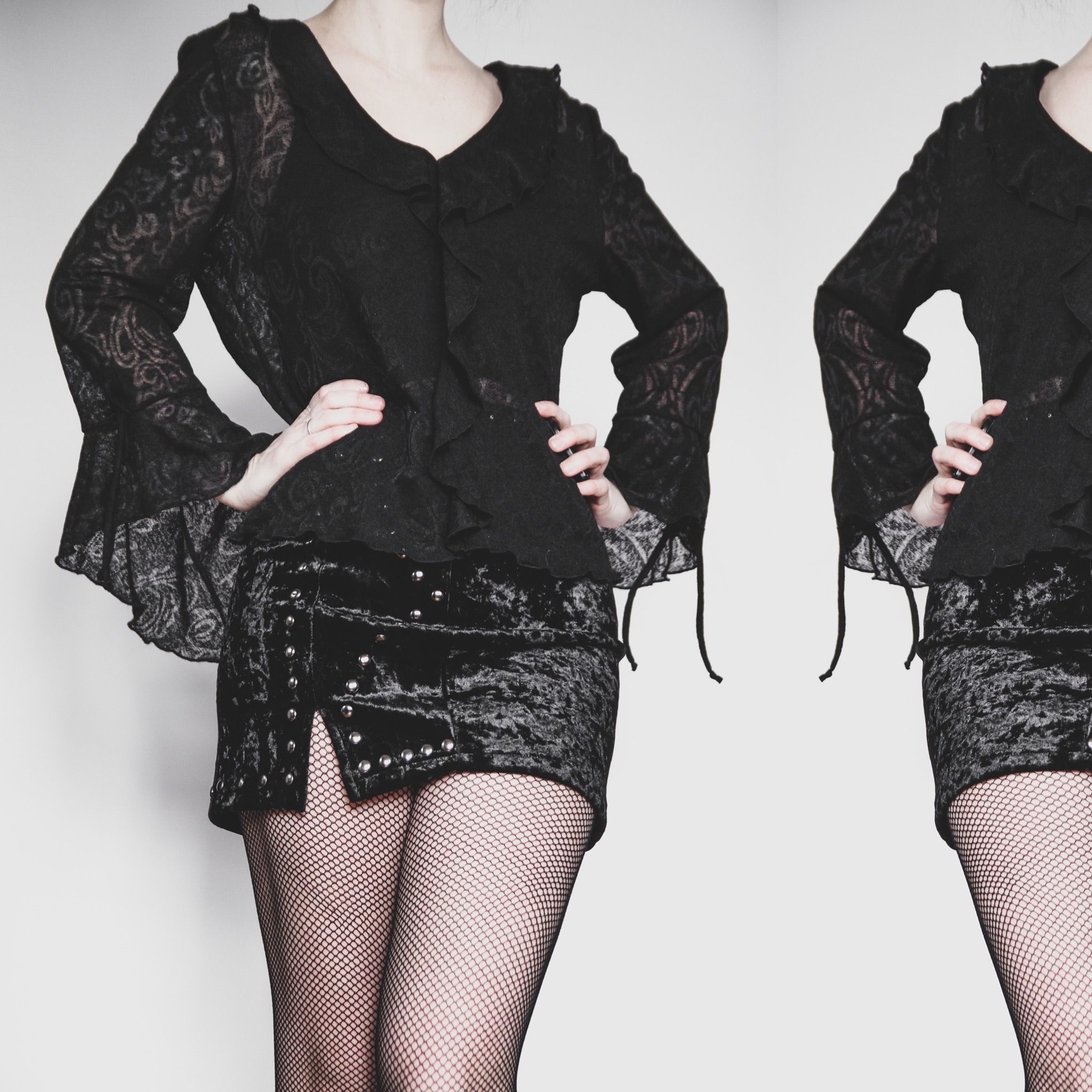 Vintage 90s fae blouse. So on trend right now! Sheer poly mesh with a swirly floral burnout pattern. Ruffle collar and a deep v-neck. Loose 3/4 drapey bell sleeves, lettuce edge trim and tie details. Boxy, slightly cropped cut. Unlined, fabric has a bit of stretch. May have some itch if you're sensitive to synthetic fabrics. Fully sheer, liner not included.