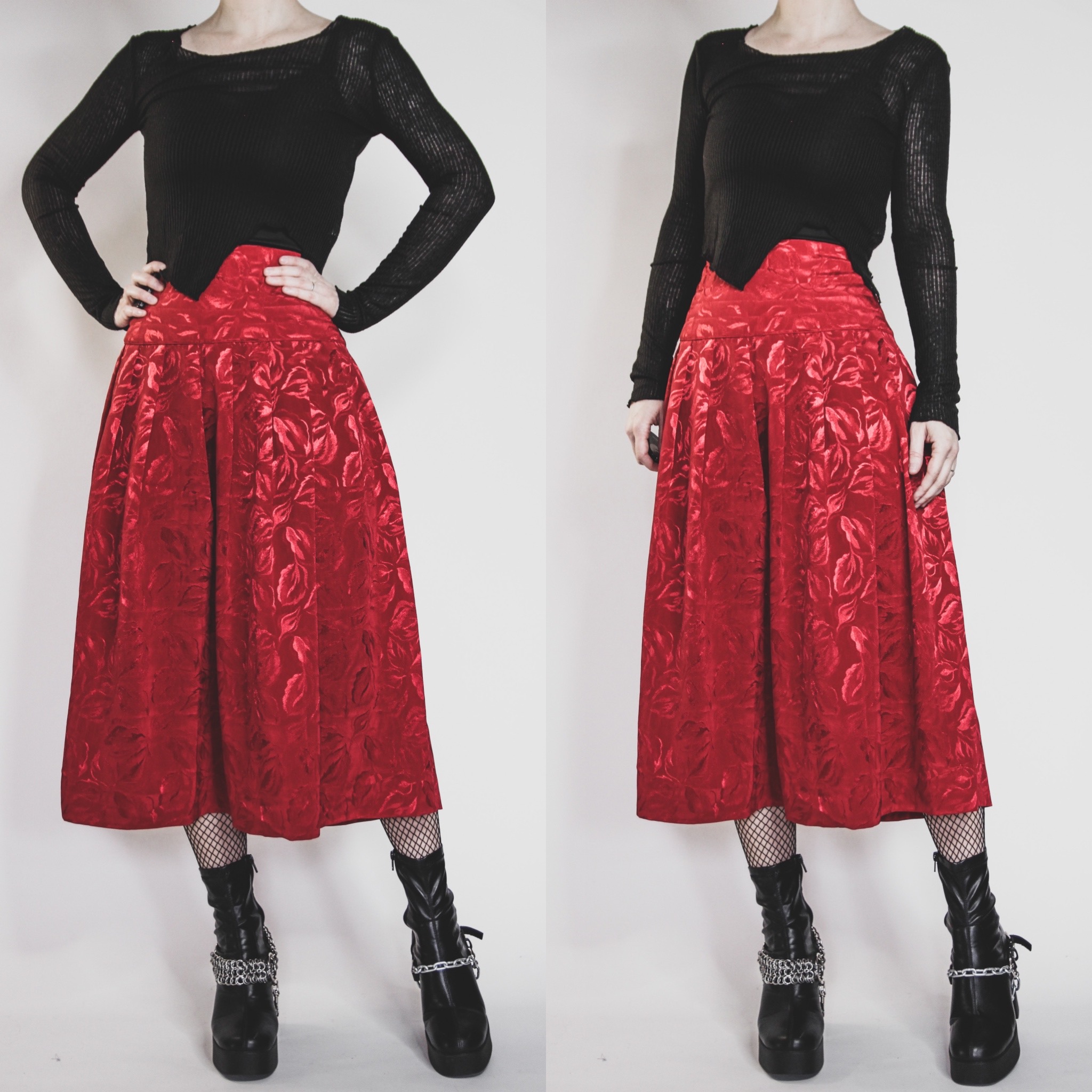 Vintage 80s floral print midi skirt. Bright cool red with a beautiful embossed floral metallic print all over. High waist with a hidden size zip. Drop-waist pleats and a flared A-line cut. No fabric tag but feels like a lightweight poly or poly-rayon blend. Perfect Valentine's Day vibes!