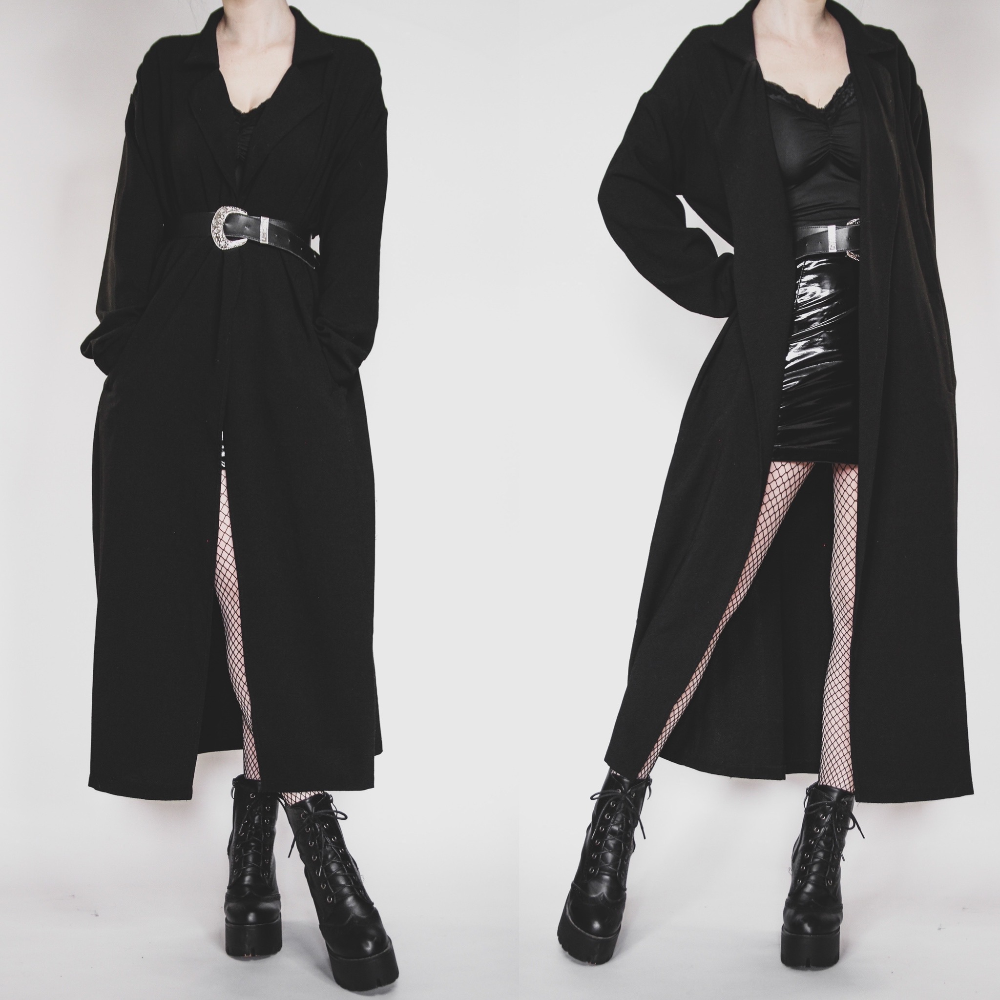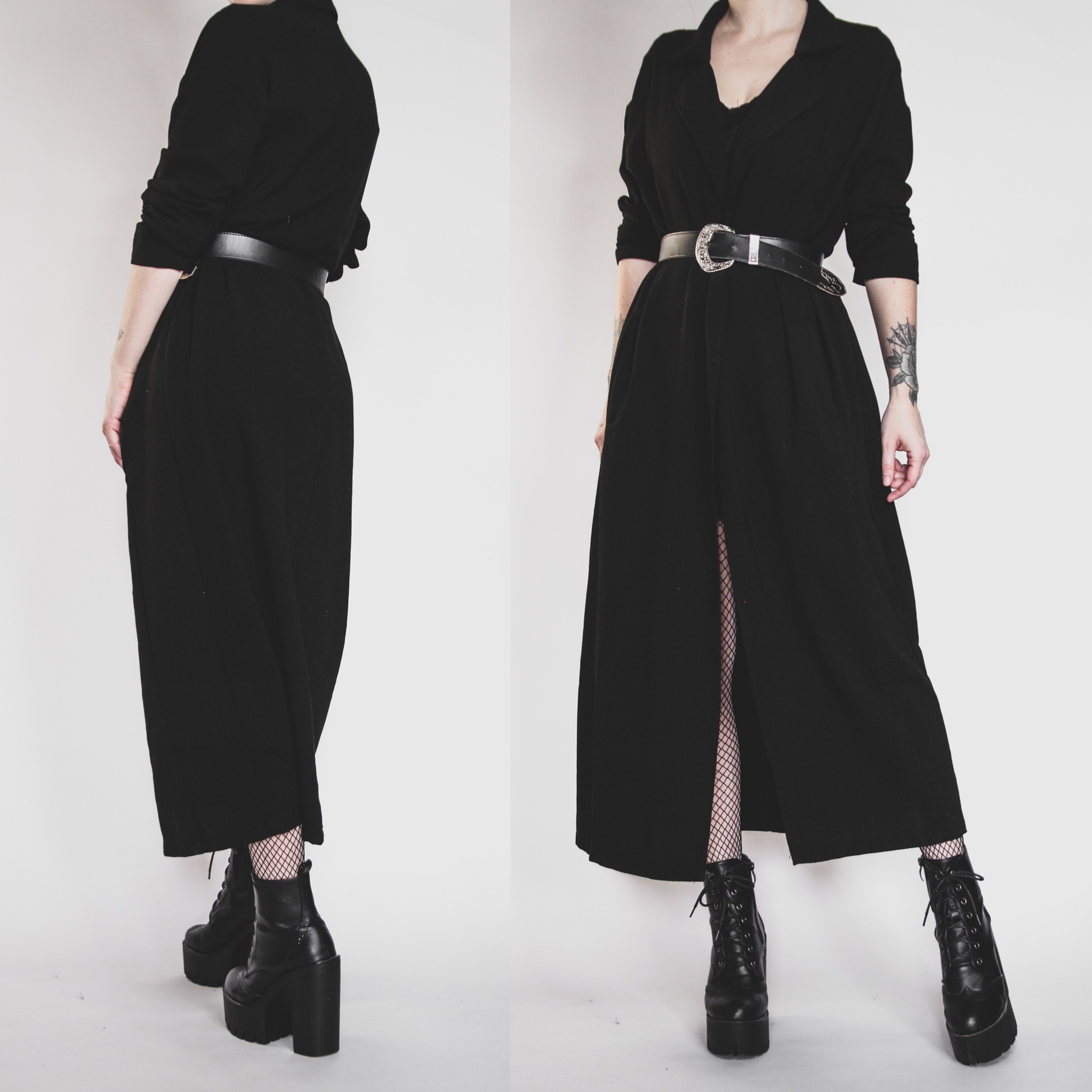 Black maxi duster. No evidence of tags, possibly vintage but more likely modern. Oversized blazer style with classic collar and lapels, but it's full length, and she has roomy pockets!!!! Not quite a blazer, cardigan, or jacket, but absolutely a goth staple piece for casual, dressy and office looks! Matte poly fabric, may have some itch if you're sensitive to synthetics. Loose sleeves. Boxy, flowy cut.