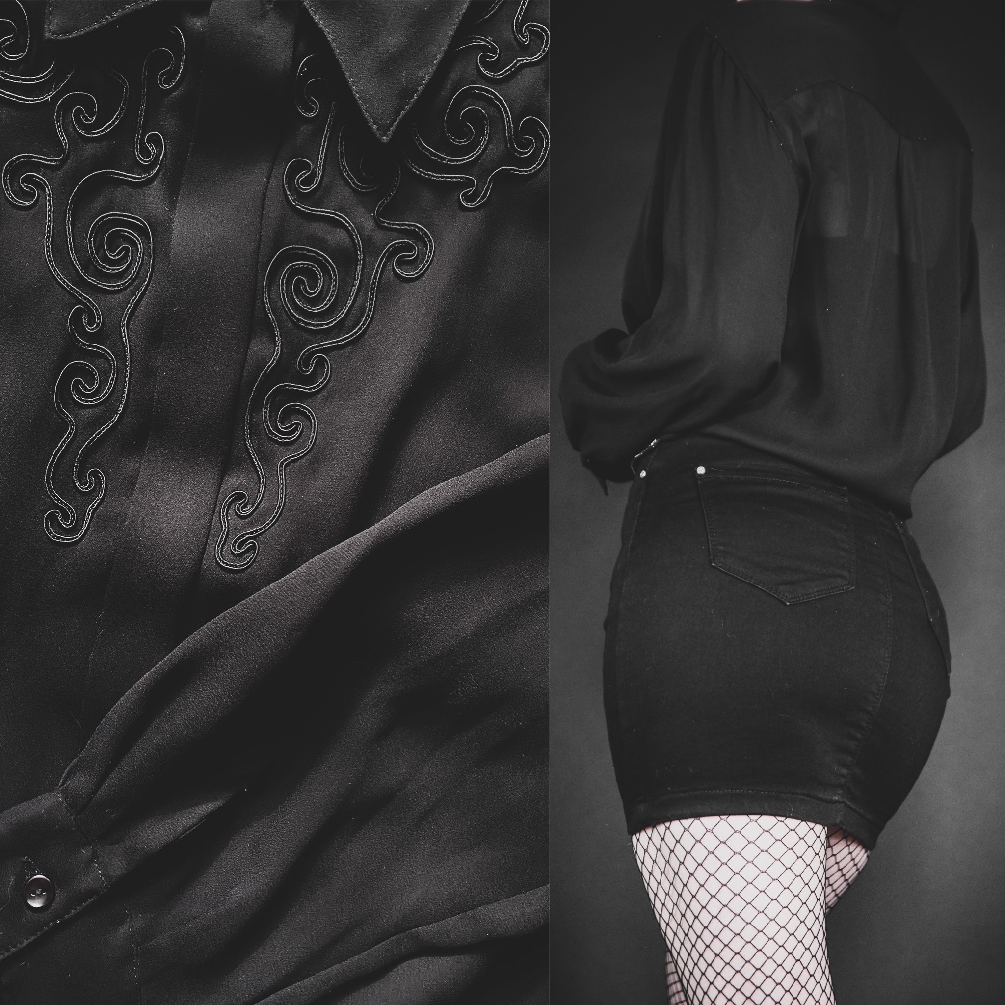 Vintage 80s Principles blouse. Perfect for the office and easy to style up or down! Sheer poly chiffon with 3D swirled embroidery detail on the front. Loose sleeves with buttoned cuffs. Functional hidden buttons down the front and a snap button for extra closure at the neck. No stretch, unlined. Boxy cut, standard length. Silky, soft and ultra-lightweight. Original shoulder pads intact but they can be easily removed if they're not your thing.