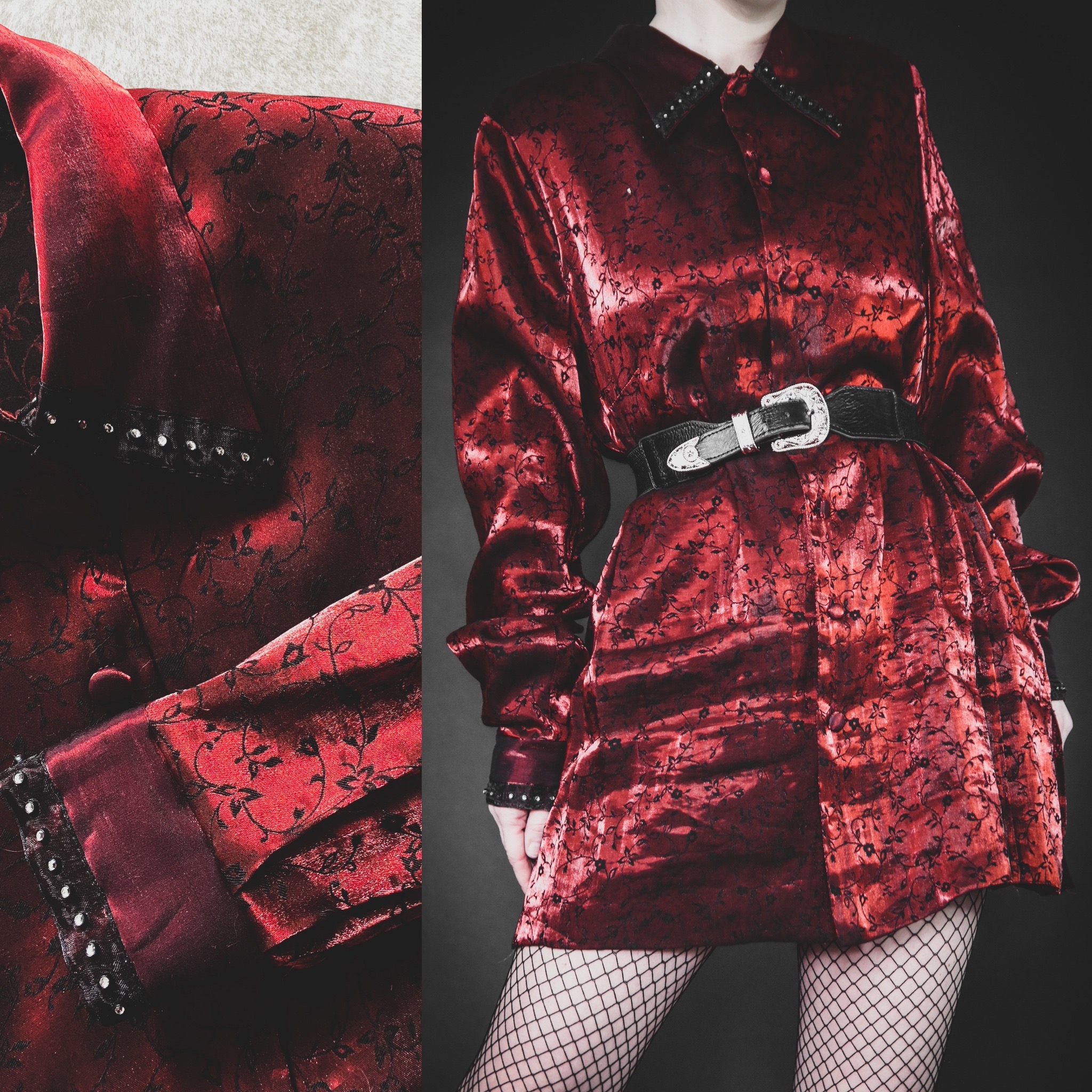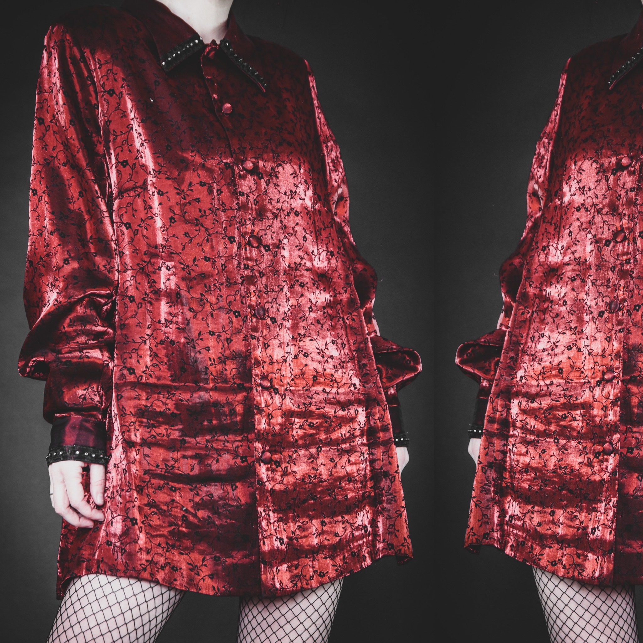 Vintage 90s metallic blouse. So fun and unique! Perfect for the office and easy to style up or down. Shiny red metallic satin (79% rayon, 21% poly) with a dainty black floral print all over. Sheer trim and rhinestone stud detail at the collar. Loose sleeves with buttoned cuffs. Functional buttons down the front and an extra button included. No stretch, unlined. Slightly slim-fit, longline cut. Silky, soft and ultra-lightweight. Original shoulder pads intact but they can be easily removed if they're not your thing.