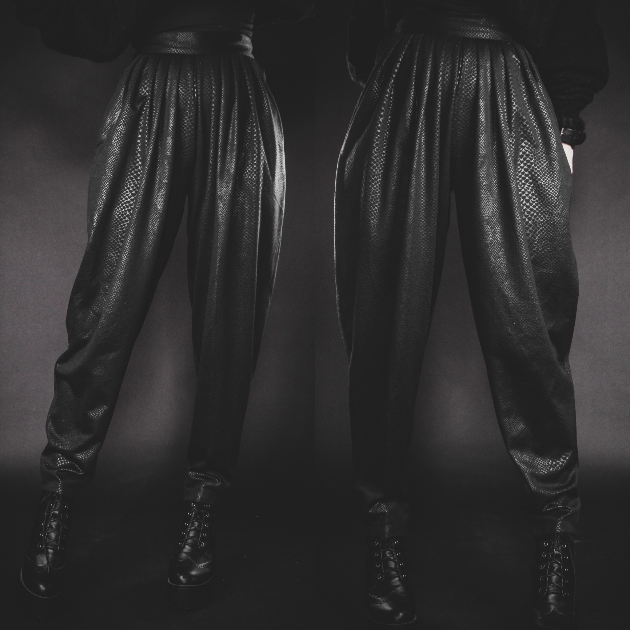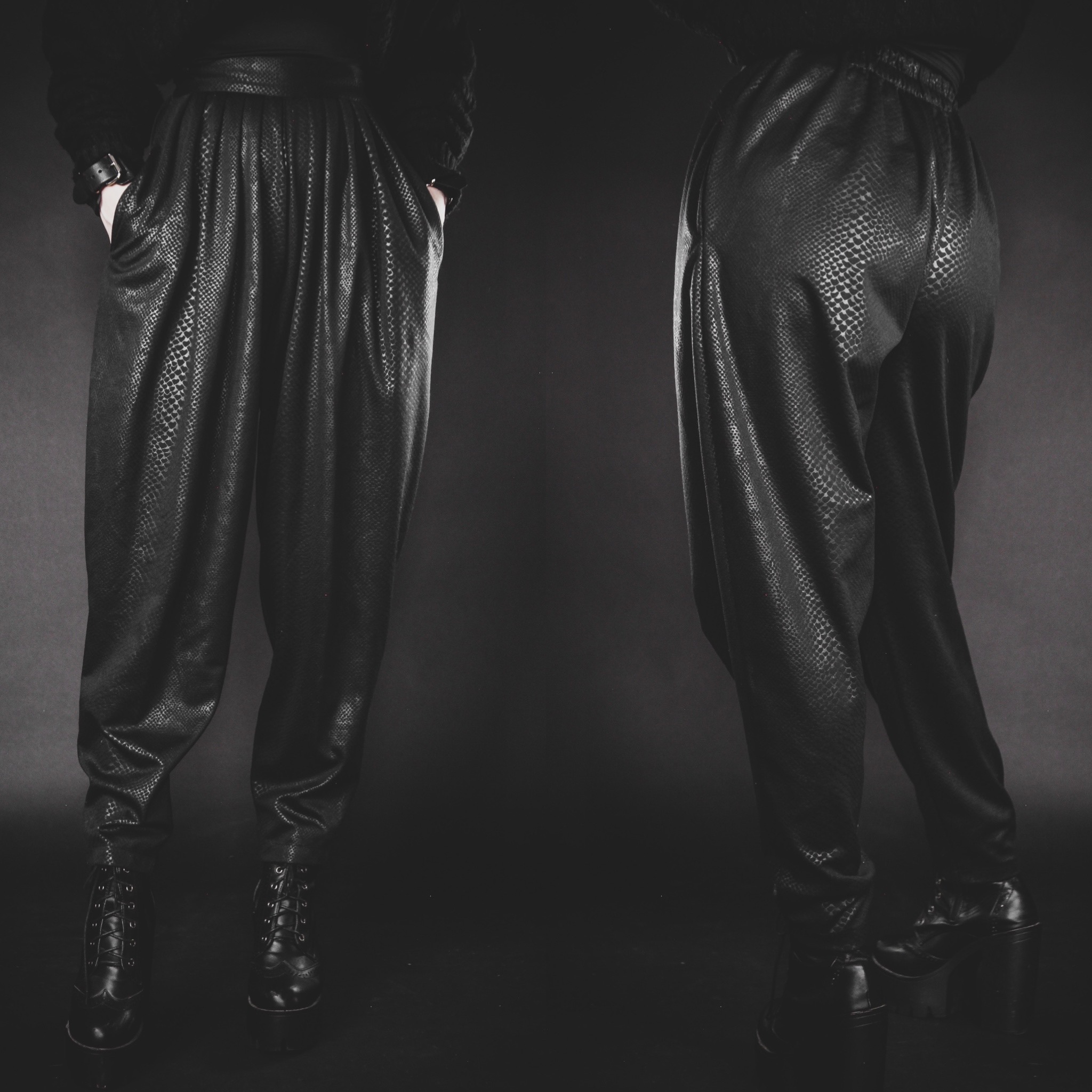 Vintage 80s off-black snake-print wide-leg trousers. These are a true vintage relic, so flattering and on-trend right now!