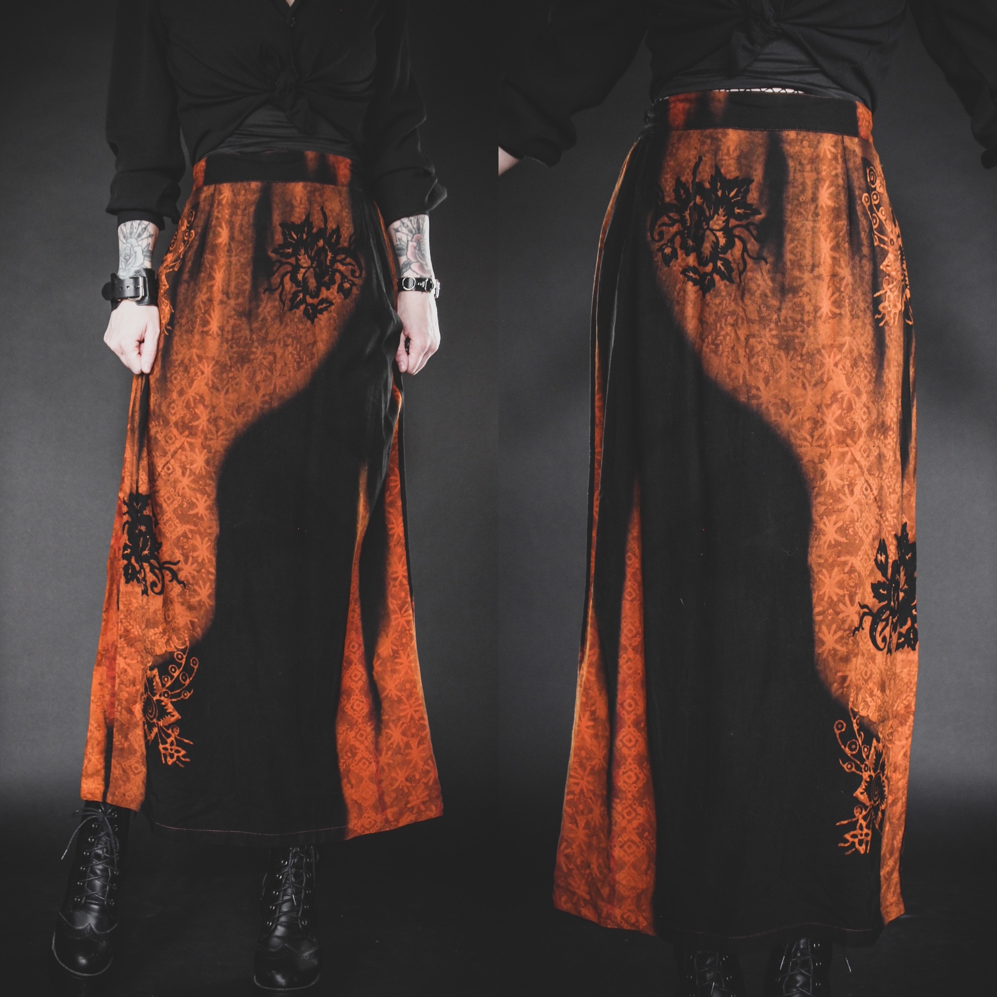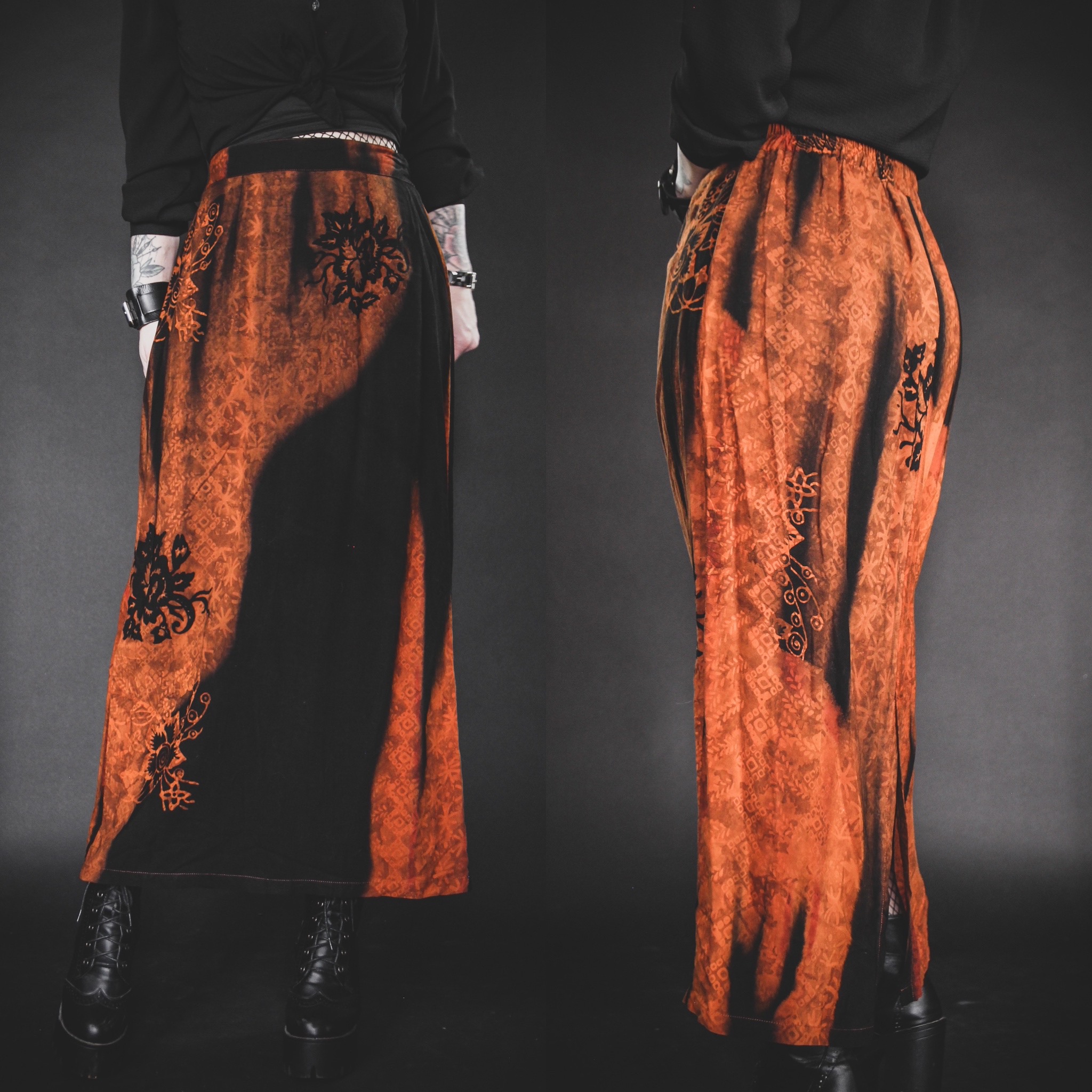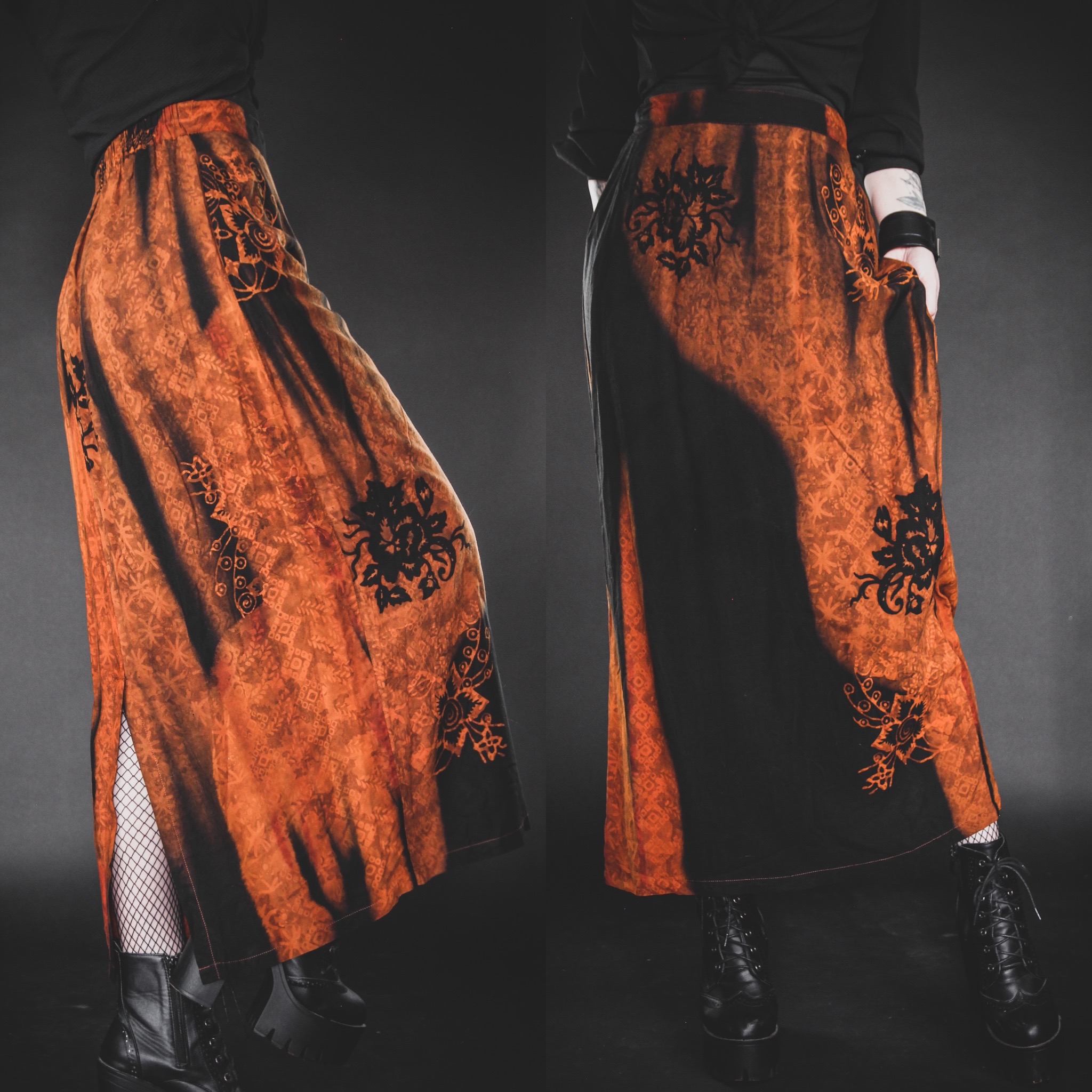 Vintage Y2K maxi skirt. Halloween meets whimsigoth vibes! Orange and black raw dye with a floral pattern. Back slit for movement and a straight cut. Pull-on style with an elastic waist, wide waistband is flat in front and ruched elastic in back. Unlined, 100% rayon, no stretch other than the waist. Lightweight and soft.