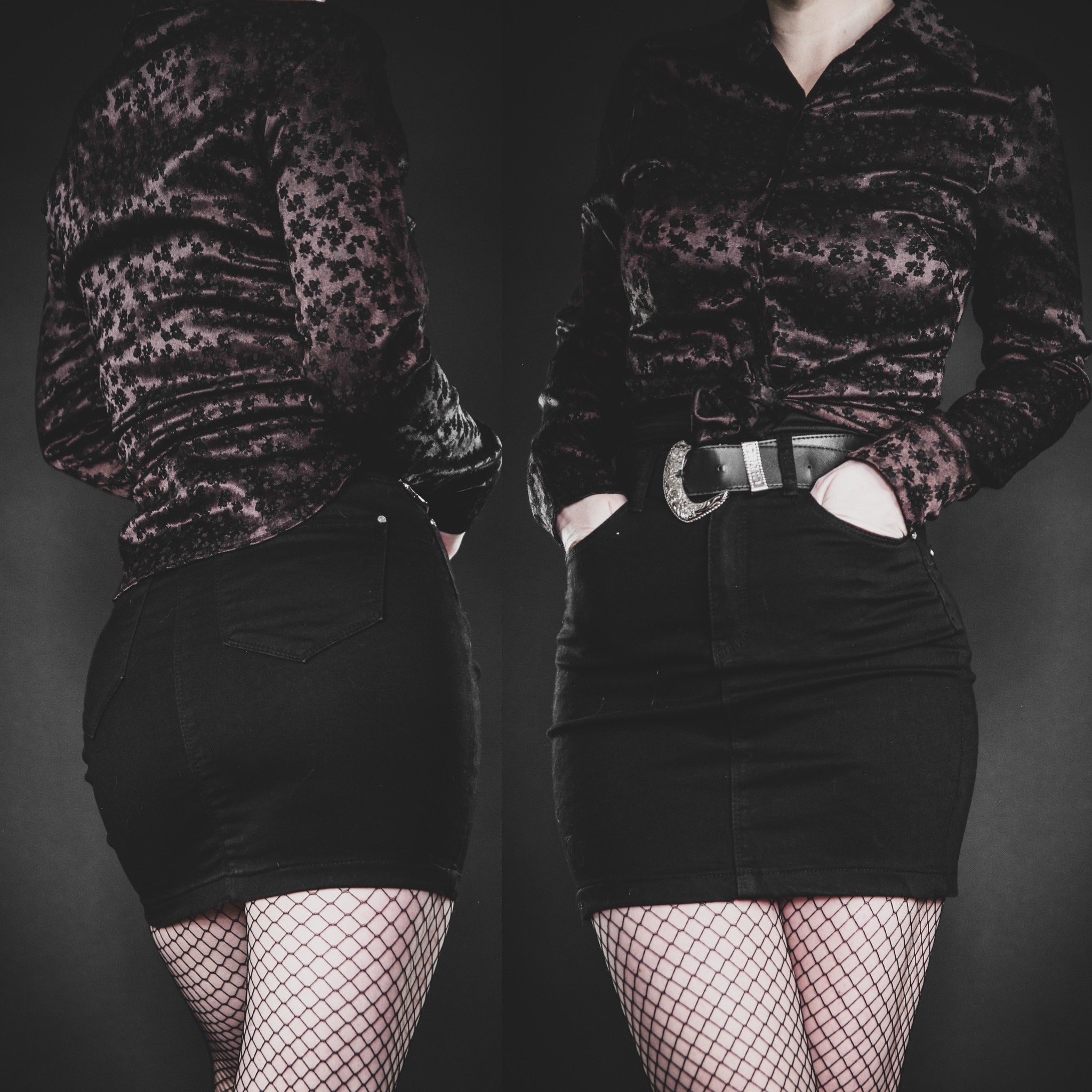 Vintage 90s H&G dark floral collared blouse. Textured poly satin in a deep purple-brown with a lovely black floral embroidered print. No stretch (fabric does have a bit of "give" for comfort), unlined. Slim fit in the torso, standard length, fitted sleeves with buttoned cuffs.