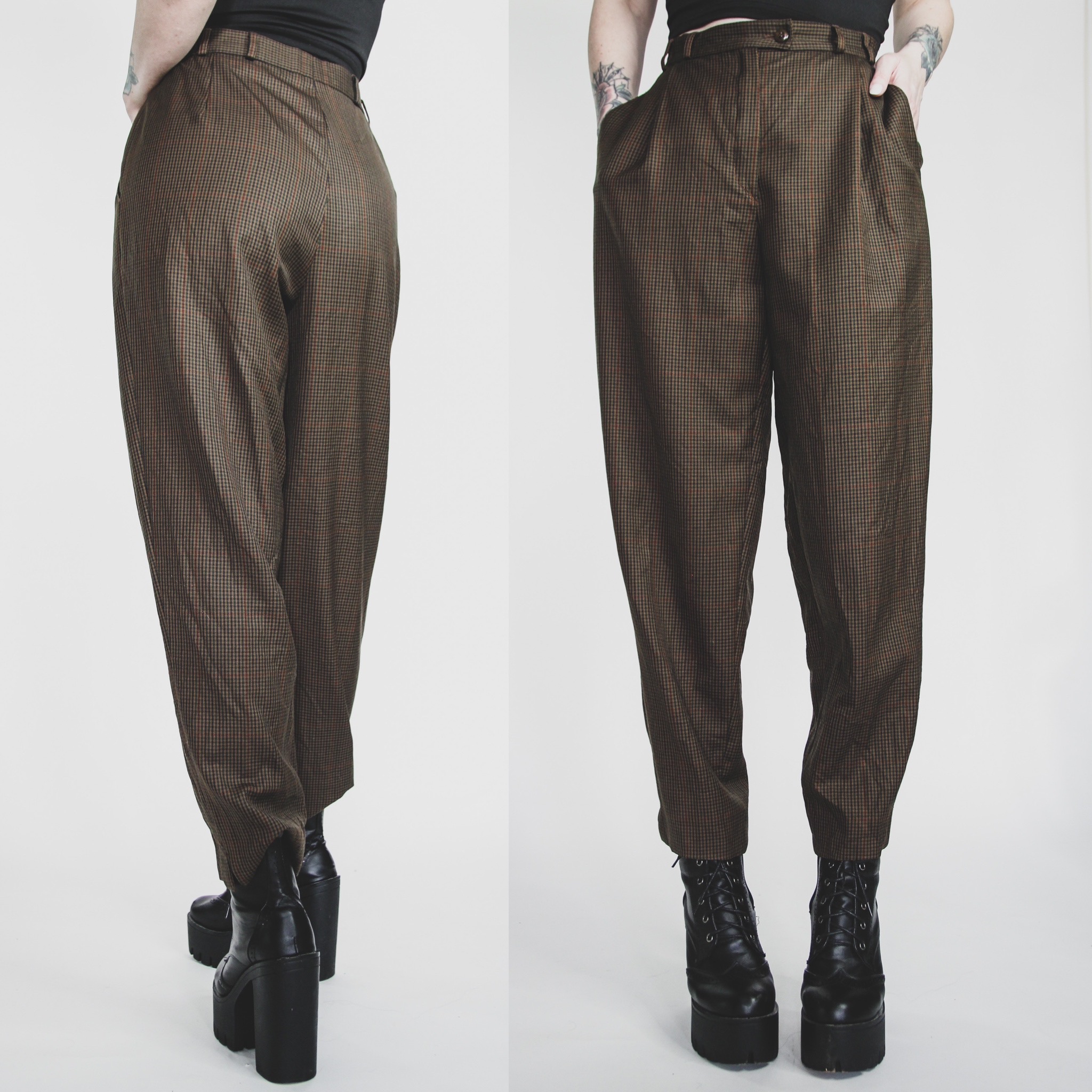 Vintage 90s Michele olive-brown plaid wide-leg trousers. These are a true vintage relic, so flattering and on-trend right now!