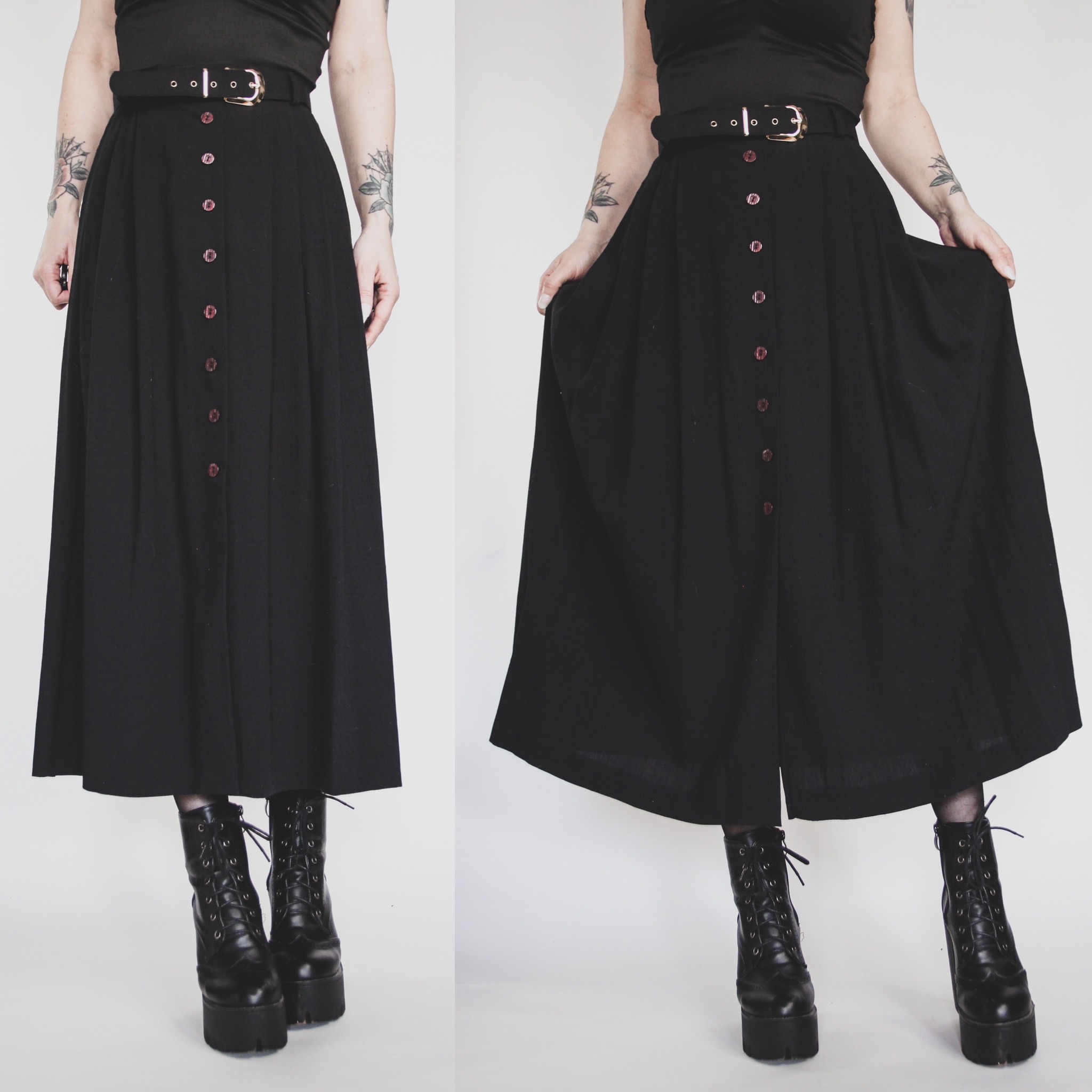 Vintage 90s Principles skirt. This is a highly coveted Last Rites signature piece! Pull-on style with decorative buttons down the front. Waistband is ruched elastic in back and flat in front, with belt loops. Comes with a removable, adjustable belt with brassy gold buckle and grommets - two items in one! Midweight, textured 65-35 poly-rayon fabric. High-waist, pleated, super-full A-line cut. Unlined, no stretch other than the waist.
