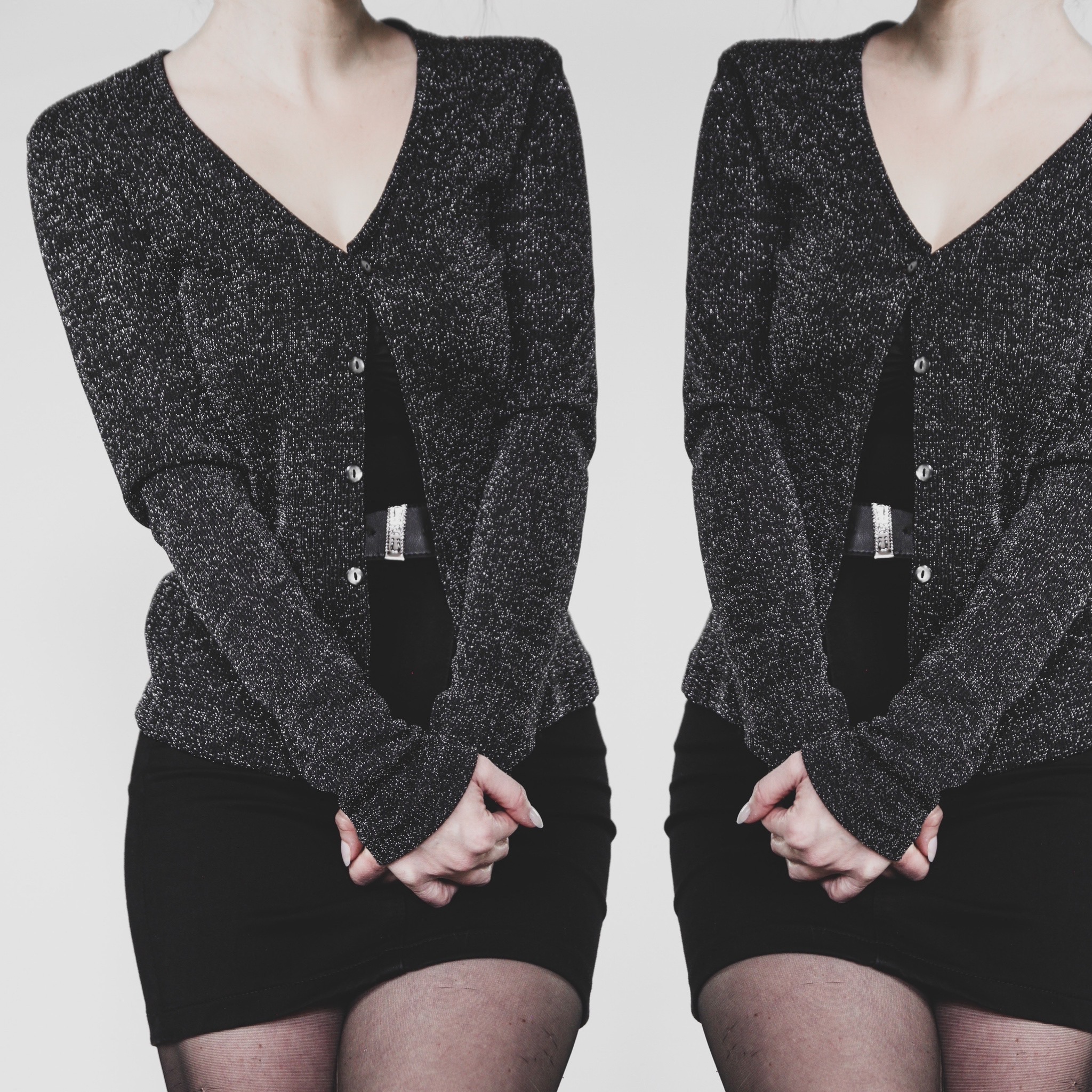 Vintage 90s Trio silver glitter crop cardigan. Lightweight ribbed knit, 60-40 nylon-lurex blend. Fitted all over with stretch. Lightweight and fitted, perfect for layering without bulk! May have some itch factor if you're sensitive to knits.