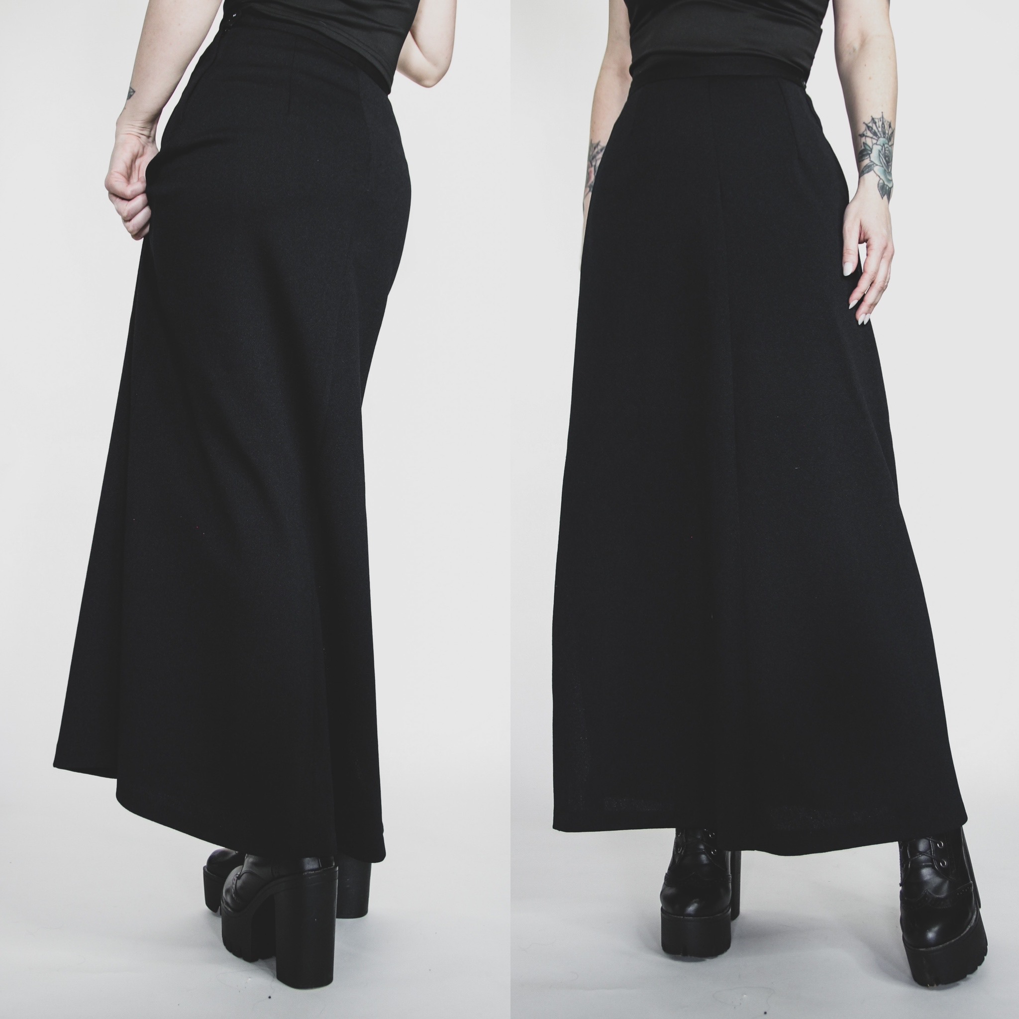 Vintage 70s maxi skirt. The perfect staple skirt! Classic matte black 100% polyester. A-line cut flares out from the waist down. High side slit for movement, but you can wear this forward-backwards-sideways if you want the slit to hit differently. Side zip with button closure at the top, unlined, no stretch. Meant to be worn high waisted.