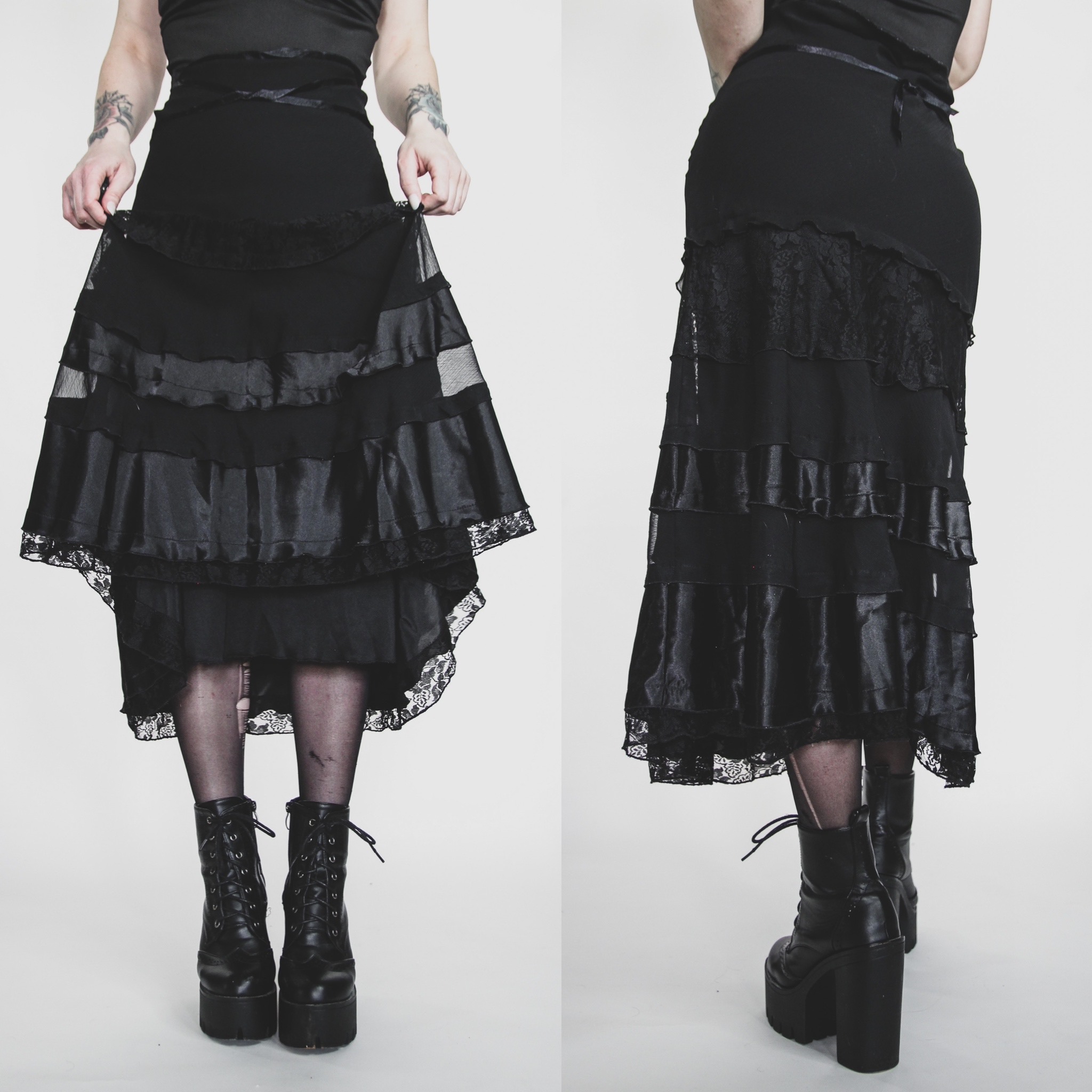 Vintage 90s Le Chateau tiered ruffle skirt - or is it a strapless dress? You decide! Foldover hidden elastic waistband. Removable looong satin ribbon tie belt - can be wrapped around the hips or tied in a bow. Flared A-line cut with tiered satin and lace ruffle accents. Main fabric is a textured semi-sheer poly chiffon. Fully lined in a separate layer of black poly. Pull-on style, no stretch other than the waist.