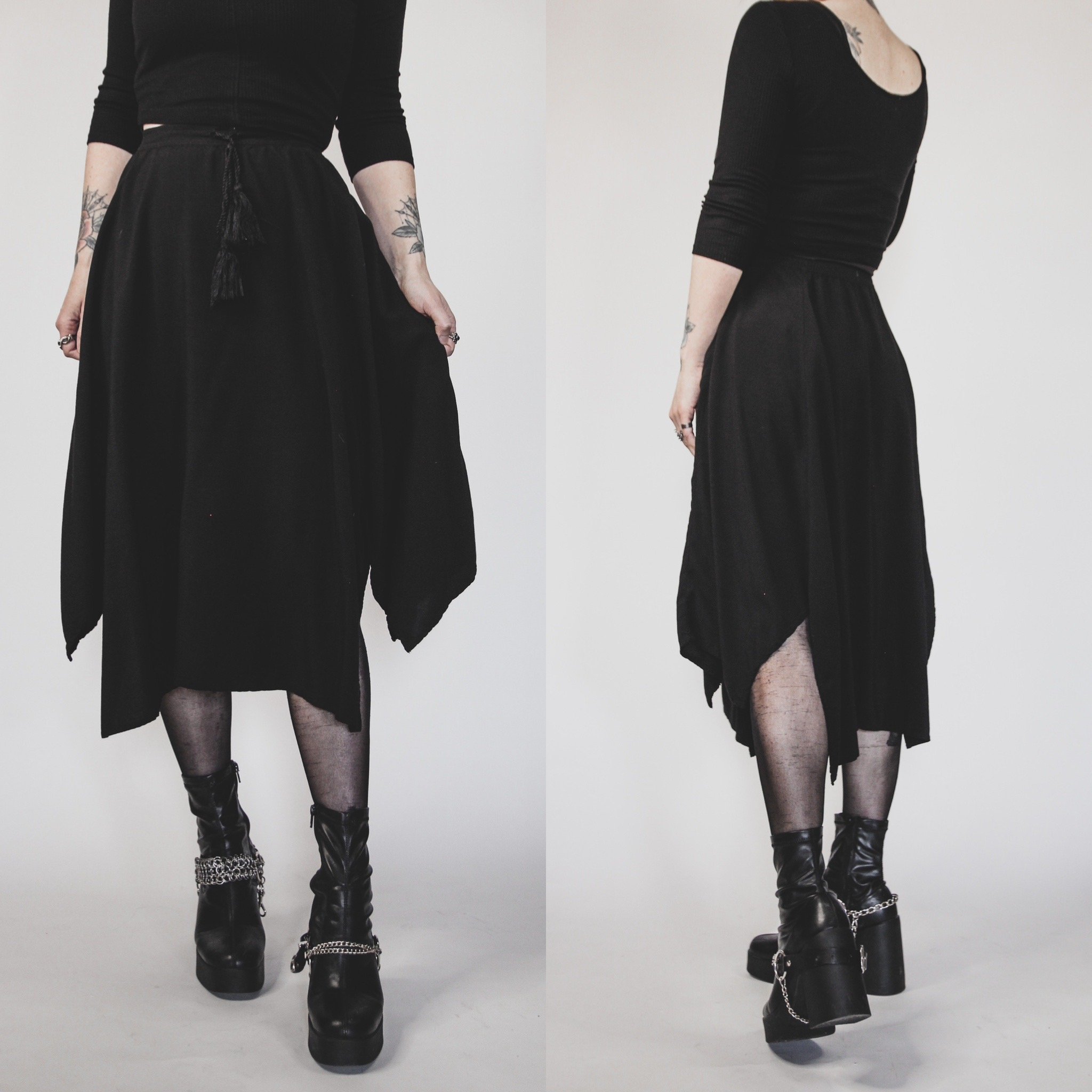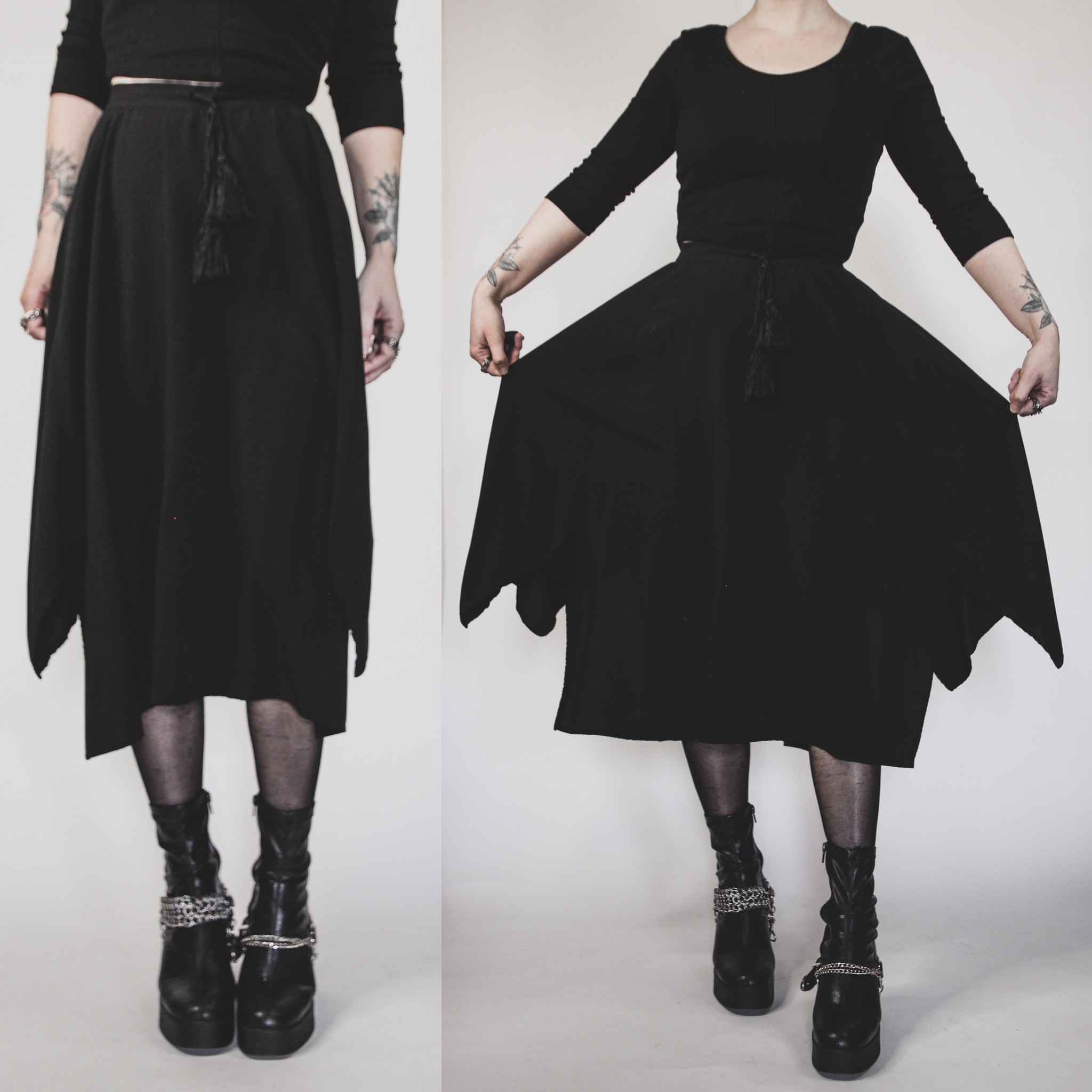 Y2K Hollister classic black handkerchief-hem skirt. The ultimate whimsigoth witch skirt! Soft, flowy matte black viscose fabric. Asymmetrical hemline with tons of movement. Can be worn high, mid or low waisted. Unlined, pull on style with a wide waistband (ruched in back, flat in front) and an adjustable cinch tie.