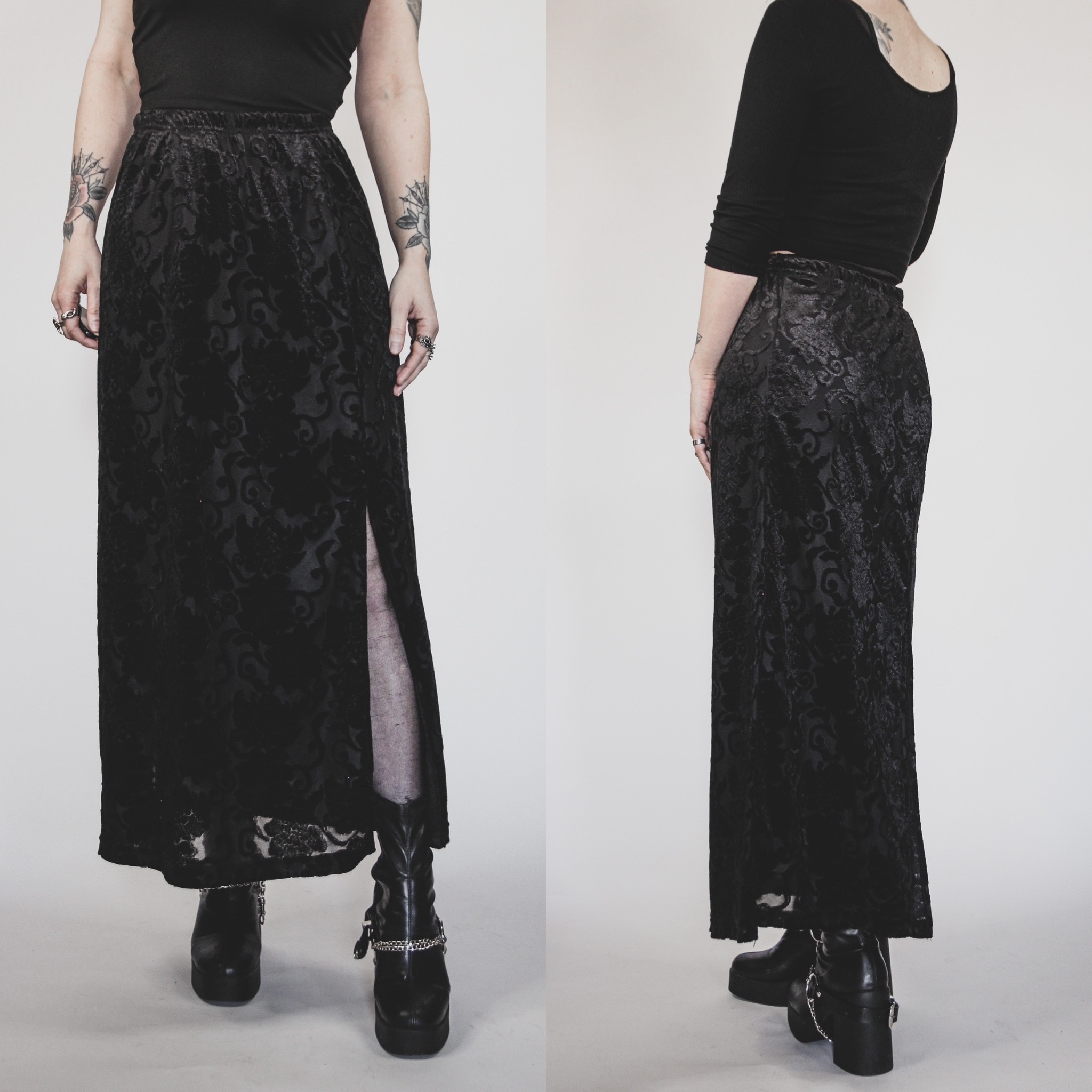 Vintage 90s Gloria Vanderbilt velvet burnout maxi skirt. This is a Last Rites signature piece! Outer layer is 100% poly with a gorgeous crushed velvet burnout overlay. Fully lined in a separate layer of nylon satin. Pull on style with a ruched elastic waisband. High side slit for movement and drama!
