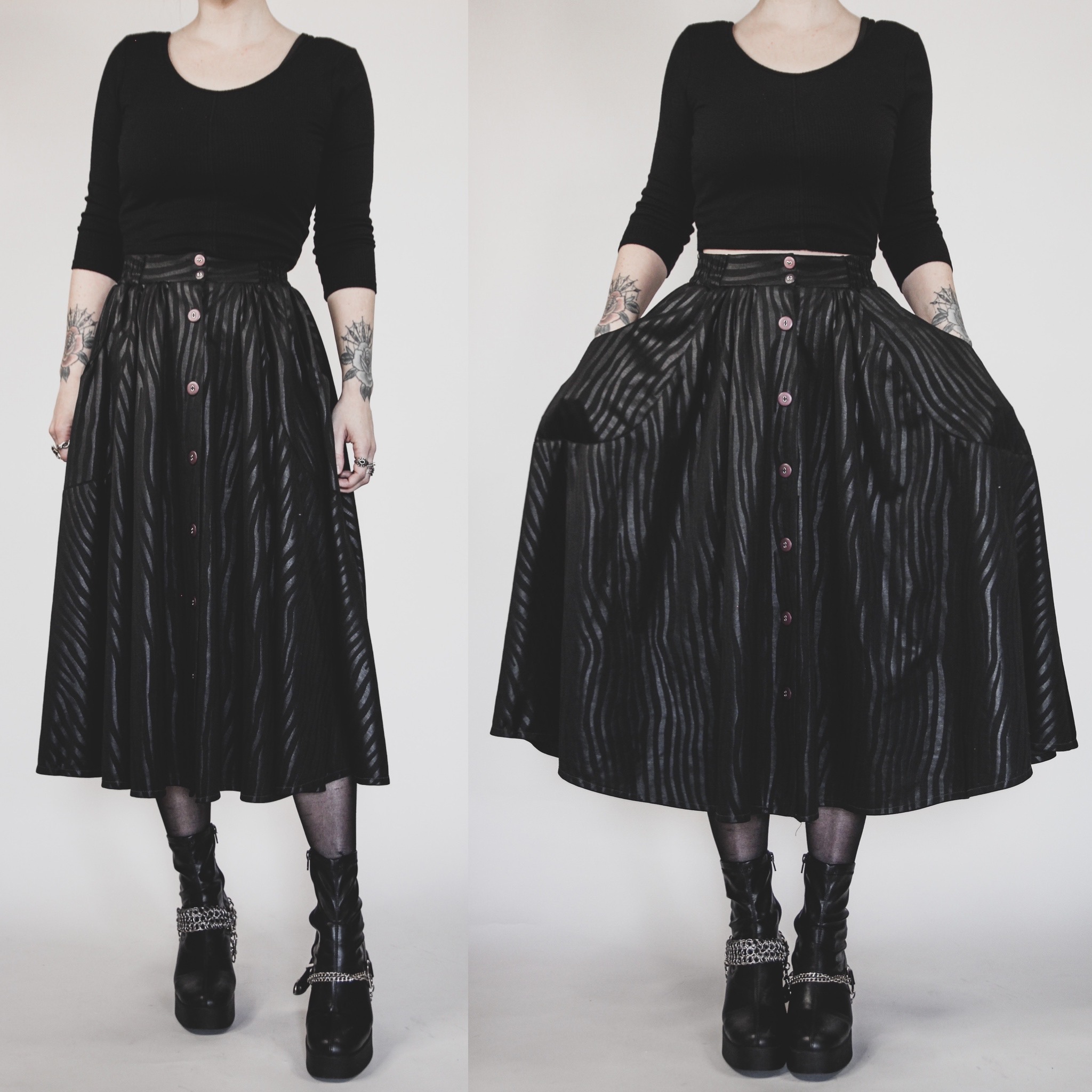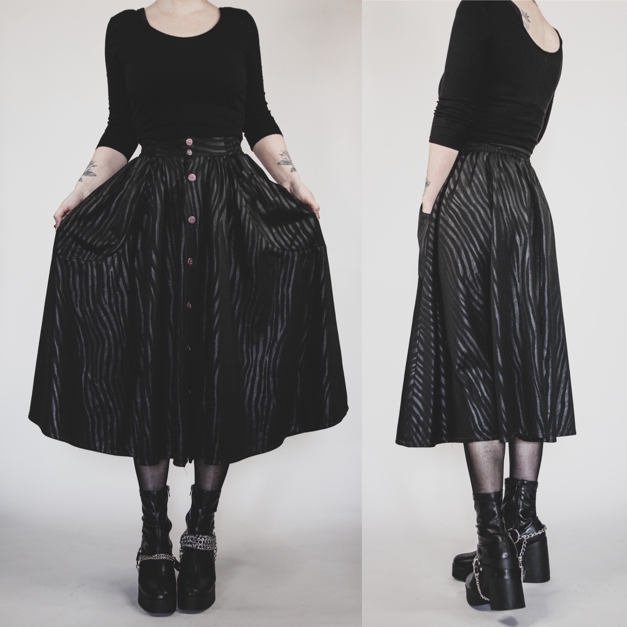 Vintage 70s made in Montreal button down skirt. So flattering, comfortable, versatile and beautifully made! Subtle shiny zebra print, functional buttons, and huge front pockets! Wide elastic waistband is ruched in back , flat in front. All buttons are functional. Unlined, no stretch other than the waist. Fabric tag is gone but feels like a thick, sturdy synthetic blend knit.