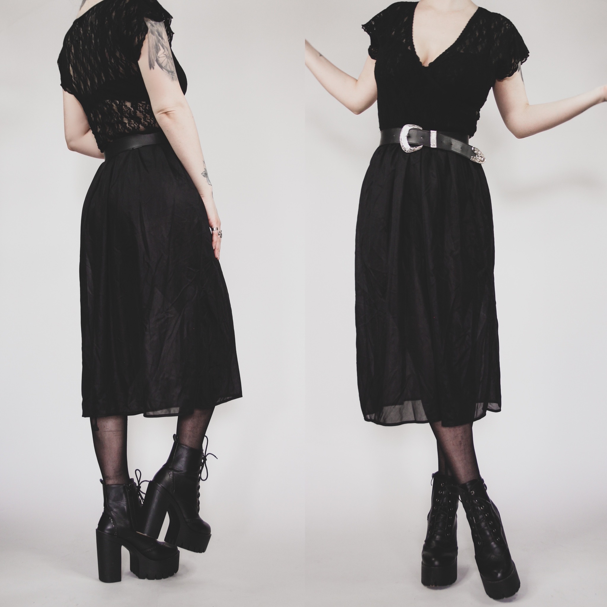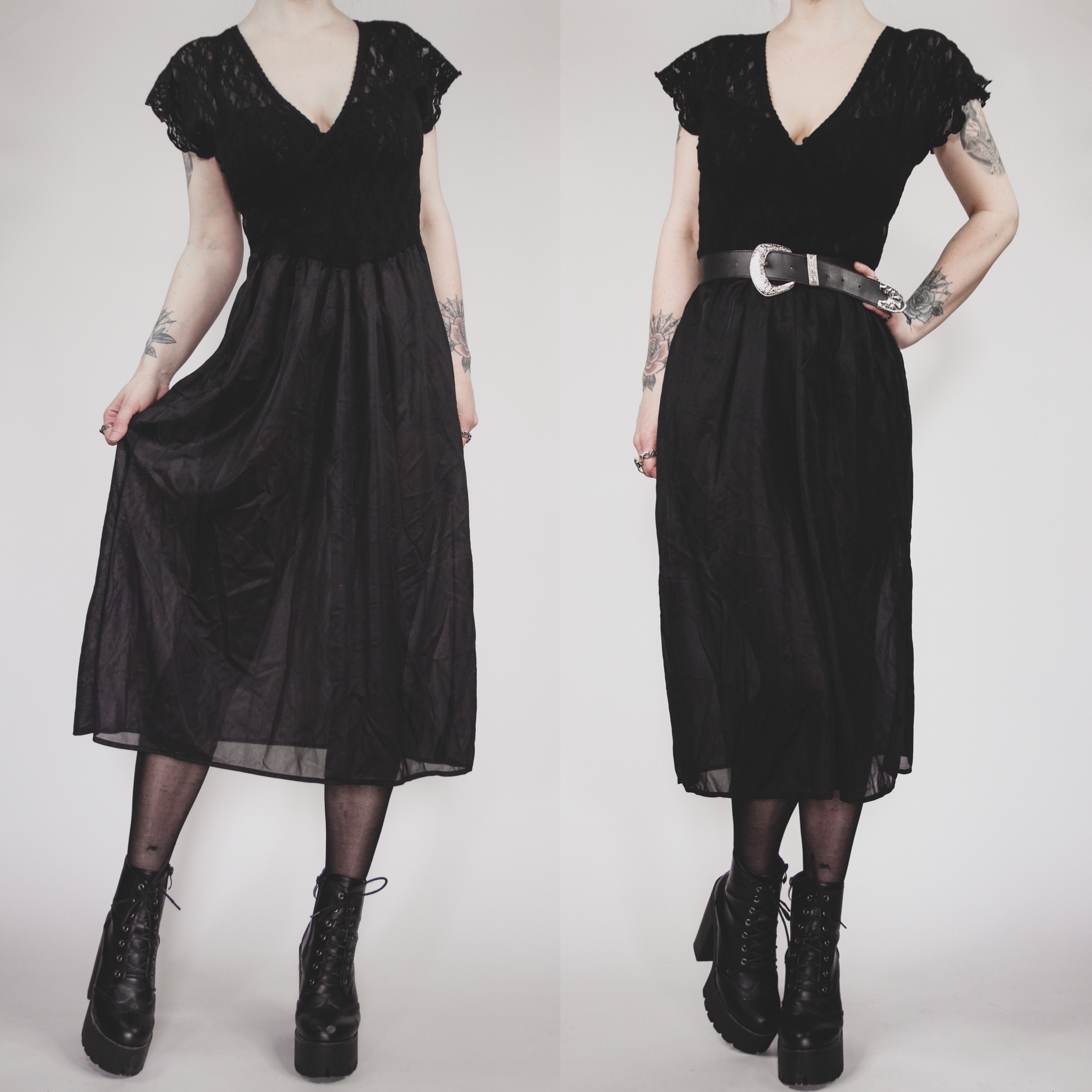 Vintage 90s Avon slip dress. Sheer, stretchy lace bodice with cap sleeves and lettuce edge trim. Wrap front v-neck bust. Elastic waist with a A-line cut satin skirt. 100% nylon. Thin fabric, lightweight, super soft and comfortable. Skirt is very delicate and will be sheer in direct light or when stretched. Can be worn as loungewear or daywear, great for layering! Belt not included.