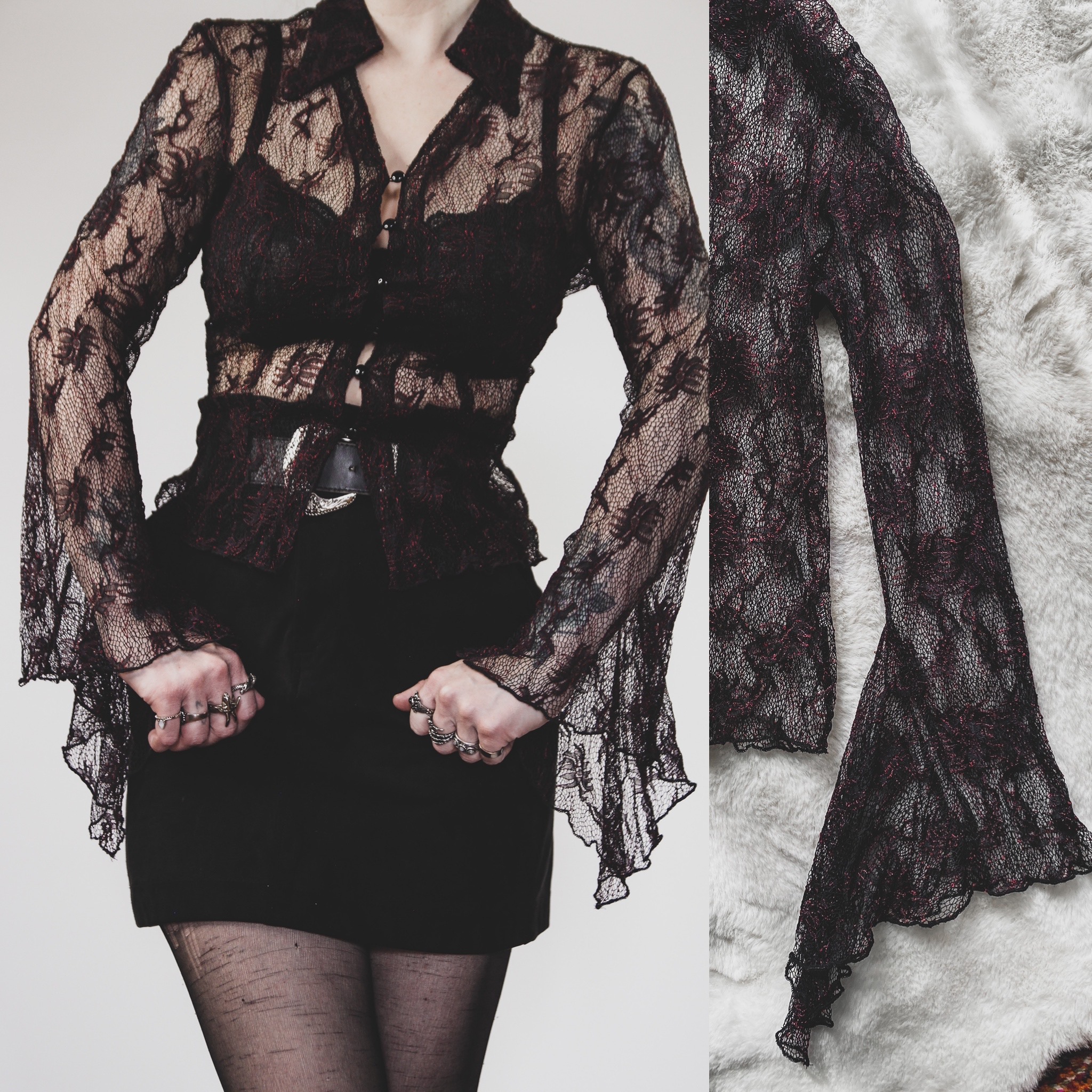 Vintage 90s sheer blouse. So on trend right now! Sheer, delicate black and red floral mesh - not exactly lace but a similar vibe. Adjustable corset-style lace-up back detail with a loooong satin cord, allows you to cinch the waist as tight as you like! Classic collar. Fitted, drapey bell sleeves, lettuce edge trim and glossy seed buttons down the front. Slim fit, standard length. Fabric has a bit of give. May have some itch if you're sensitive to synthetic fabrics. Fully sheer, liner not included.